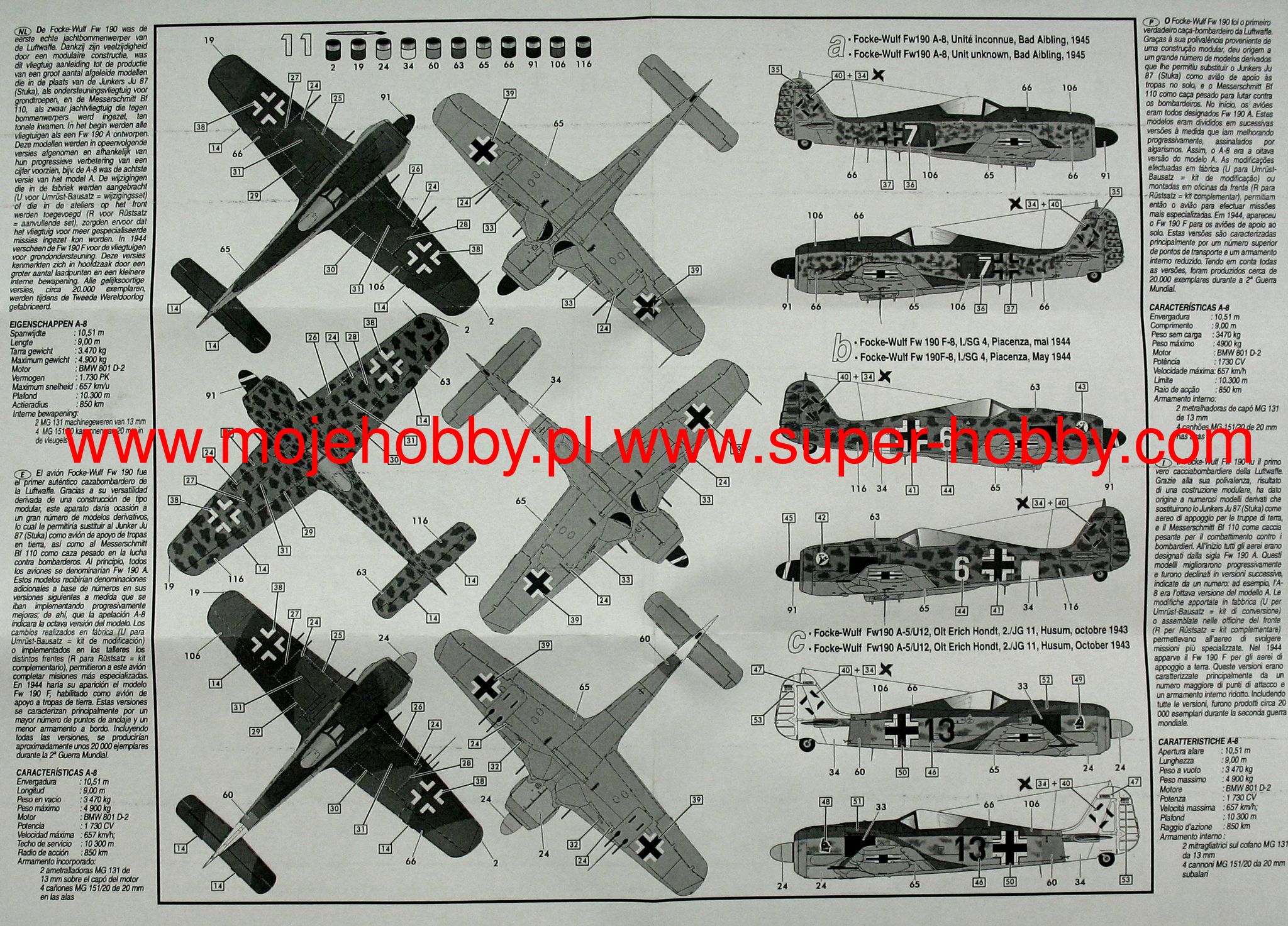 The Focke-Wulf Fw-190 is a German, single-engine, full-metal fighter aircraft with a covered cabin in the low wing design of the Second World War. The pilots considered the Fw-190 to be a better aircraft than the Messerschmitt Bf-109. A self-supporting low wing with a working Fw-190 coating was commissioned by the Luftfahrtministerium, assembled in the fall of 1937. Kurt Tank submitted two propulsion proposals - the first with a liquid-cooled Daimler-Benz DB 601 engine, and the second with the new BMW 139 radial engine. The latter was chosen, and the work started in the spring of 1938 was headed by Obering R. Blaser. The first prototype of the Fw-190V1 was ready in May 1939, and it was flown in Bremen on June 1, 1939 by Captain Hans Sander. The second prototype, the FW-190V2, armed with two MG131 and two MG17 machine guns - all 7.92 mm caliber, was flew in October 1939. To reduce aerodynamic drag, both were equipped with a tunnel air inlet in the propeller cap, but problems with overheating of the engine resulted in a return to the proven NACA shield design. Before the tests of these prototypes began for good, the decision was already made to replace the BMW 139 engine with a stronger, but longer and heavier BMW 801. It required many changes, strengthening the structure and moving the cabin back, which later became a source of problems with the center of gravity. The advantage was the removal of problems with exhaust gas permeation and overheating of the cabin interior due to its direct vicinity to the BMW 139 engine. The third and fourth prototypes were abandoned, and the Fw-190V5 with the new engine was completed at the beginning of 1940. Later, it received wings with a wingspan enlarged by one meter (from the original 9.5 m), which made it 10 km / h slower, but it increased the rate of climb and improved maneuverability. It was marked Fw-190V5g, and the variant with the shorter wing was Fw-190V5k. The first seven machines of the Fw-190A-0 information series had a short wing, the rest - a longer one. The first operational unit equipped with the Fw-190 - 6./JG 26 stationed at Le Bourget, declared its operational readiness in August 1941 and from the first meeting of the new fighter with the British Supermarine Spitfire, its advantage over them became apparent. During the war, a dozen or so versions of this great plane were created. The machines of the "A" version, along with a dozen or so modernizations, served as fighter planes. The versions marked "B" and "C" were only prototypes of high-altitude fighters intended for fighting strategic bombers, but they did not enter into serial production. The "D" variant, as the only one of the Fw-190s, was powered by the new 1750HP Jumo 213A engine and was the German response to the P-51 Mustang. The new engine extended the fuselage by several dozen centimeters. This variant also performed mainly hunting and high-altitude fighter tasks. Numerous variants of the "F" version were used as fighter-bombers as direct support of the battlefield. The "G" version played the same role as the "F" version, but had a greater range. During the entire war, over 20,000 copies of this one of the best fighters of World War II were produced. Technical data (version Fw-190A-8): length: 9m, wingspan: 10.51m, height: 3.95m, maximum speed: 656km / h, rate of climb: 15m / s, maximum range: 800km, maximum ceiling 11410m , armament: fixed-2 MG131 13mm machine guns and 4 MG151 20mm cannons (2 MG 151 / 20E cannons for the D-9 version).
