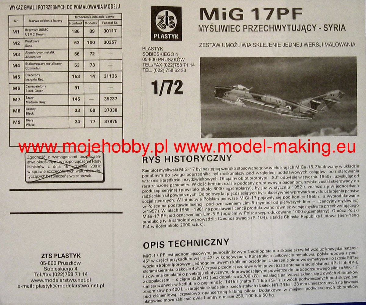 The Mikojan-Guriewicz MIG-17 is a Soviet, single-engine, medium-wing metal jet fighter with slanted wings and a classic tail, known in the NATO code as Fresco. The prototype flight took place in January 1950. The MIG-17 was an extension of the MIG-15 design. The changes focused on a new engine (Klimov WK-1F), better aerodynamics and the use of radar on one of the development versions. Several basic versions of this aircraft were created. The first mass-produced version is the MiG-17F. Another one, equipped with a radar, was the MiG-17PF, and the MiG-17PFU version had the option of guiding the missiles using the on-board radar. The plane was also produced under the license of min. in Poland and China. In Poland, serial production started in 1956 under the designation Lim-5, and an assault version (Lim-6bis) was also created. The MIG-17 aircraft is still used by the Mali and North Korean aviation. Technical data (MIG-17F version): length: 11.26m, wingspan: 9.63m, height: 3.8m, maximum speed: 1145km / h, rate of climb: 65m / s, maximum range: 2060km, maximum ceiling 16600m armament: fixed - 2 Nudelman-Rikhter NR-23 cannons, caliber 23 m and 1 Nudelman N-37 cannon, caliber 37 mm, suspended - up to 500 kg of bombs and rockets.