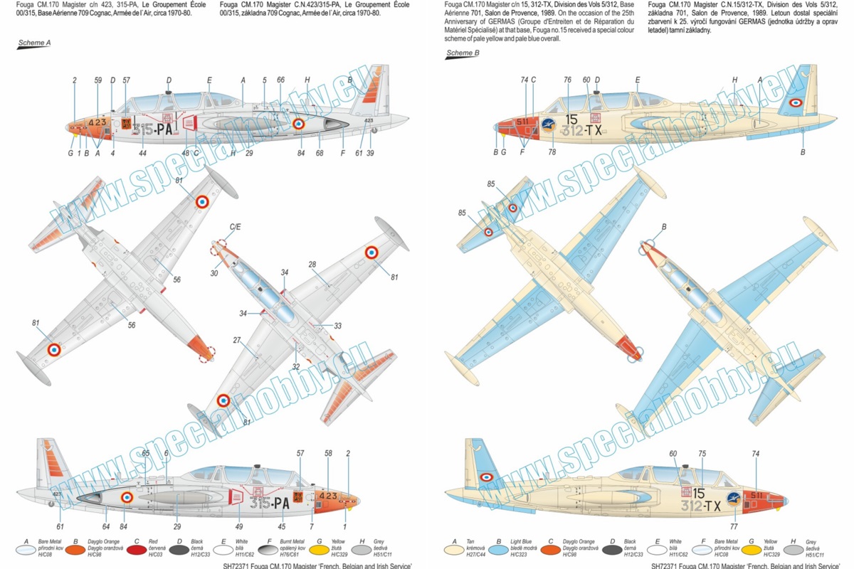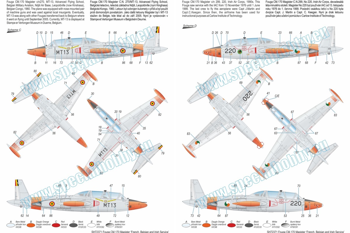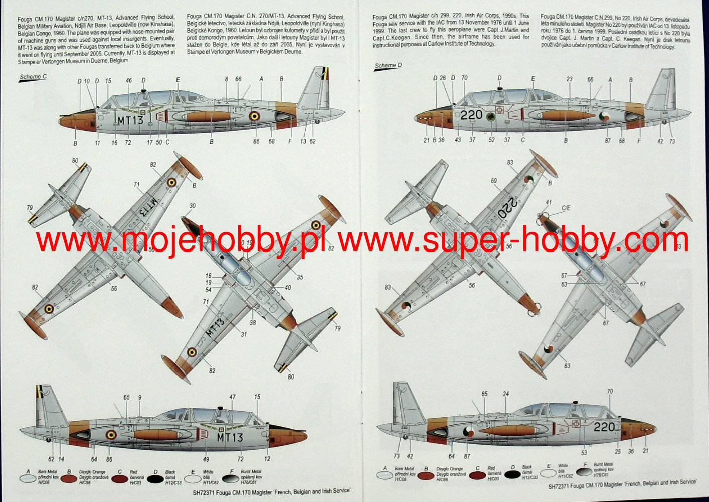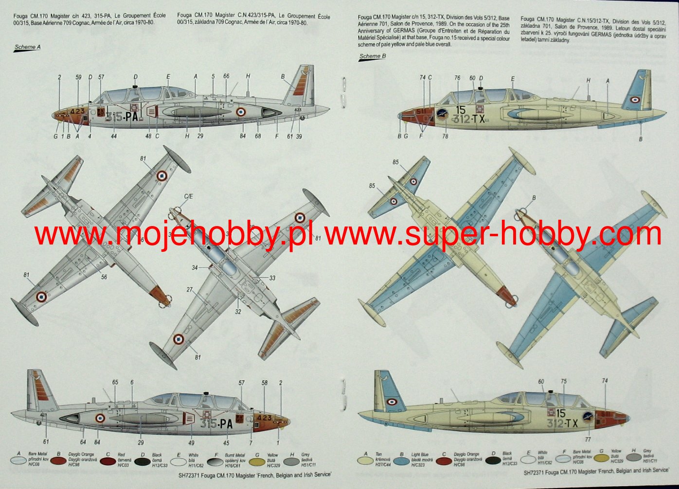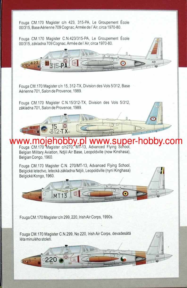 Fouga CM.170 Magister французский двухмоторный учебно-тренировочный самолет, разработанный Fouga et Cie. Это был первый французский реактивный самолет. Полет прототипов состоялся 23 июля 1952 г., а в линейные части они поступили в 1954 г. Машина отличалась необычным хвостом-бабочкой, а также отличными летными параметрами и высоким общим качеством конструкции. Он был оснащен двумя двигателями Turboméc Marboré IIA. Также существовала специальная версия для ВМС Франции (CM.175 Zephyr), которая поднялась в воздух в 1959 году. Самолет строился по лицензии в Германии, Финляндии и Израиле. В последней из этих стран они были вооружены стрелковым оружием, бомбами и неуправляемыми ракетами класса воздух-земля, что делало CM.170 легким штурмовиком. Такие переработанные участники в Шестидневной войне 1967 г. Благодаря своим очень хорошим характеристикам самолет прослужил во французской армии до 1980-х годов. Технические данные: Максимальная скорость: 715 км/ч, скорость набора высоты: 17 м/с, максимальный потолок 11000 м, максимальная дальность полета: 925 км, вооружение: стационарное 2 пулемета калибра 7,5 мм, подвесное до 140 кг бомбы или ракеты.