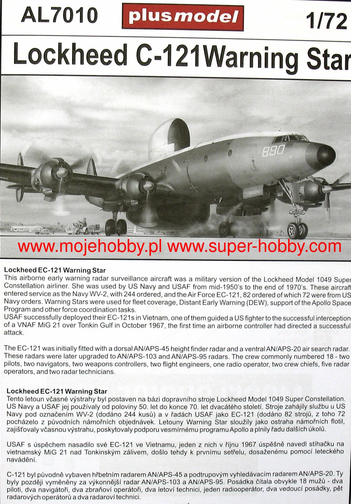 The Lockheed EC-121 Warning Star was a US Cold War early warning and surveillance aircraft. The drive was provided by four engines Wright R-3350 Cyclone 3400 hp each. The first flight of this machine took place in October 1949. In the years 1953-1958 serial production took place, which led to the creation of about 230 aircraft of this type. The machine did not have a permanent on-board armament. The EC-121 Warning Star was the first true mass-produced early warning aircraft in the history of aviation. The demand for such machines was submitted by the USAAF and the US Navy shortly after the end of World War II, and due to the avant-garde (at that time) of the entire project, the machine did not enter production until 1953. In order to shorten the research and development time, it was decided to adapt the Lockheed Super Constellation transport plane to the new needs. It was modernized mainly by adding a very extensive avionics and radars: search (AN / APS-95) and air (AN / APS-103). During its long service, which lasted until 1982, the machine was modernized and various electronic solutions were tested on it. The only user of these planes was the United States.