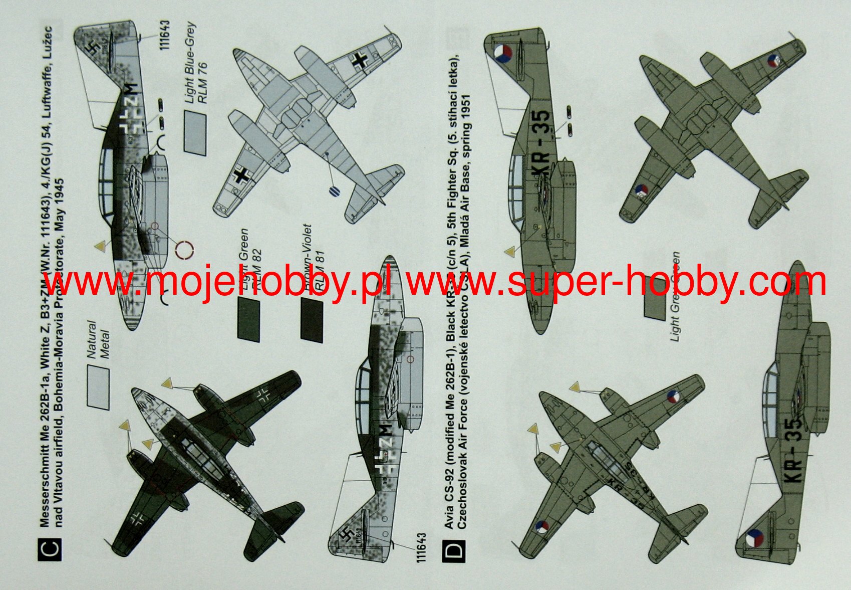The Messerschmitt Me-262A Schwalbe (German: swallow) is a German twin-engine fighter-bomber with a metal structure in a low wing configuration. The Me-262 was the first combat jet in the history of aviation. The first flight with piston engines took place in 1941, and with turbojet engines on July 18, 1942. The first design of the airframe, designated P.1065, was presented in 1939 and, surprisingly, differed significantly from the final version. It was quickly decided to use oblique wings and test the airframe in flight with piston engines (Jumo210), which was successfully completed in 1941. As a result of problems with the target power unit (BMW003 engine), the first jet flight on the Me-262 took place with Junkers Jumo004 engines. Interestingly, the Me-262 was structurally ready for serial production at the end of 1942. However, his entry into the line was significantly delayed. Firstly, due to material deficiencies (especially tungsten and chrome deficiencies), which forced technological changes, secondly, because of the failure of the BMW003 engines, and third, because of Hitler's resistance to the Me-262 being a fast bomber, not a fighter. As a result of all factors, the plane entered the line only in 1944! Given the already overwhelming advantage of the Allies in the air, the shortage of fuel and trained crews of the Me-262 could not have had a major impact on the course of the war. Undoubtedly, it was technologically superior to enemy aircraft, and the loss ratio was 1: 9 in favor of the Me-262. A total of about 1,400 machines were built, but only about 300 entered service. Several development versions of this revolutionary aircraft were created: a bomber (A-2a), reconnaissance (A-1a / U3 and A-4a), day fighter (A-1a) and night fighter (B-1a / U1). Technical data (version Me-262A-1a): length: 10.6m, wingspan: 12.6m, height: 3.5m, maximum speed: 900km / h, speed of climb: 20m / s, maximum range: 1050km, ceiling maximum 11450m, armament: fixed - 4 30mm MK108 cannons, underslung - 24 R4M rockets, 55mm caliber, up to 1000 kg of bombs.