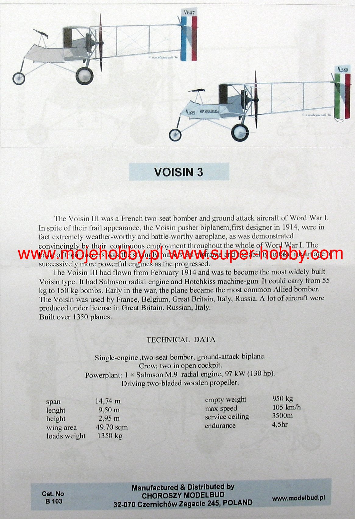 Voisin III is a French bomber in a mixed biplane design with a fixed undercarriage from the First World War. The flight of the prototype took place in 1914, and shortly after that, mass production began, which led to the creation of over 800 aircraft of this type. The machine was powered by a single Salmson M.9 radial engine with 130 HP. The deck armament consisted of a single machine gun - most often a 7.7 mm Lewis. The plane could also carry bombs weighing up to 91 kilograms. Voisin III was developed as a development and modernization of Voisin I airplanes. The main design change was to replace the Le Rhone engine with a unit with a higher maximum power, which necessitated a slight reinforcement of the whole structure. Voisin III was a machine with a push propeller, not a pull propeller. It was not characterized by fantastic performance, but it was very stable in flight, reliable and easy to pilot, which made it quite popular among Entente airmen. Among the users of this plane - apart from France - there were also Russia, Great Britain and Italy.
