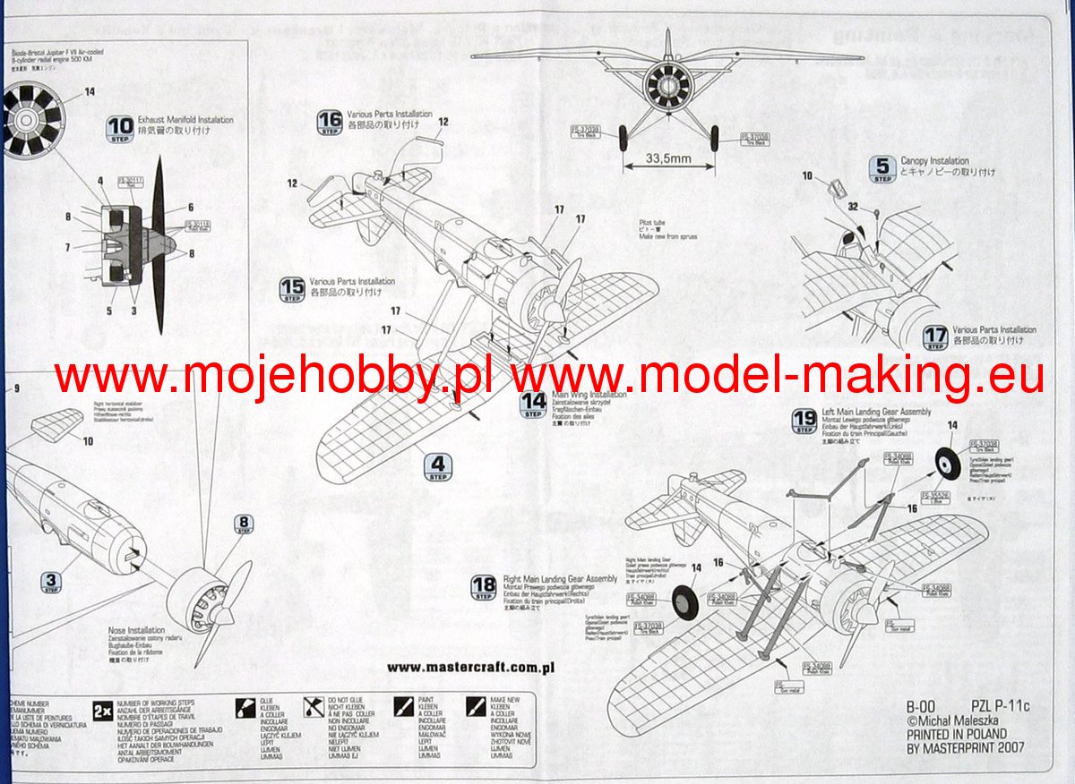 Note: Comany Mistercraft frequently changes, without any notice, the decals that come with the model, so they may differ from the photos and descriptions on our website. If you need a specific version, please let us know about that by entering the appropriate notice in the comments field when placing the order. The PZL P.11a (the so-called eleven) is a Polish, single-engine fighter plane with a metal structure with Puławski wings, a classic tail and a fixed landing gear. The flight of the prototype took place in 1931, but serial production continued in 1937-1939. The first serial version is the PZL P.11a powered by the Bristol Mercury IV S2 engine with a power of 550 HP. However, it was treated as a transitional version and only 50 were ordered. The most famous version of the "eleven" - PZL P.11c - appeared in the summer. It had an improved fuselage, wings and a vertical stabilizer. It all improved the aerodynamics of the plane. The drive unit has not changed. The interest in the construction was expressed by, among others, Romania, where 95 units of the licensed PZL P.11 were manufactured at the IAR plants. At the outbreak of the war, all versions of the P.11 were much slower than their German opponents, but at the same time had greater maneuverability, high rate of climb and a less emergency engine than German planes. They had many victories over the enemy during the September campaign, mainly as part of the Pursuit Brigade. Technical data (version P.11c): length: 7.55m, wingspan: 10.72m, height: 2.85m, maximum speed: 367km / h, rate of climb: 14.5m / s, maximum ceiling: 8000m, range maximum: 550 km, armament: fixed - 2 machine guns wz.33 cal.7.92 mm.