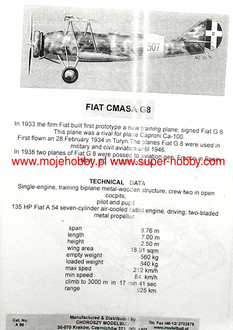 The Fiat G.8 was an Italian multi-role and connecting biplane, fixed-undercarriage design. The drive was provided by a single engine Fiat A54 with 135 HP . The prototype flight took place in 1934. Serial production started shortly after, which led to the production of about 60 examples of the aircraft. The machine did not have a permanent armament. The Fiat G.8 aircraft, which was originally designed at the CMASA plant in Pisa. However, after their takeover by Fiat in 1930, the plane changed its designation and work on it continued. Finally, a machine was created with a conservative design and technical solutions, but also with a simple design, easy to use and operate, ensuring good flight safety. From its entry into service in the mid-1930s, the Fiat G.8 was used by the Italian Air Force (Regio Aeronautica) for liaison and training tasks. Copies that survived World War II served in the Italian aviation until 1950.