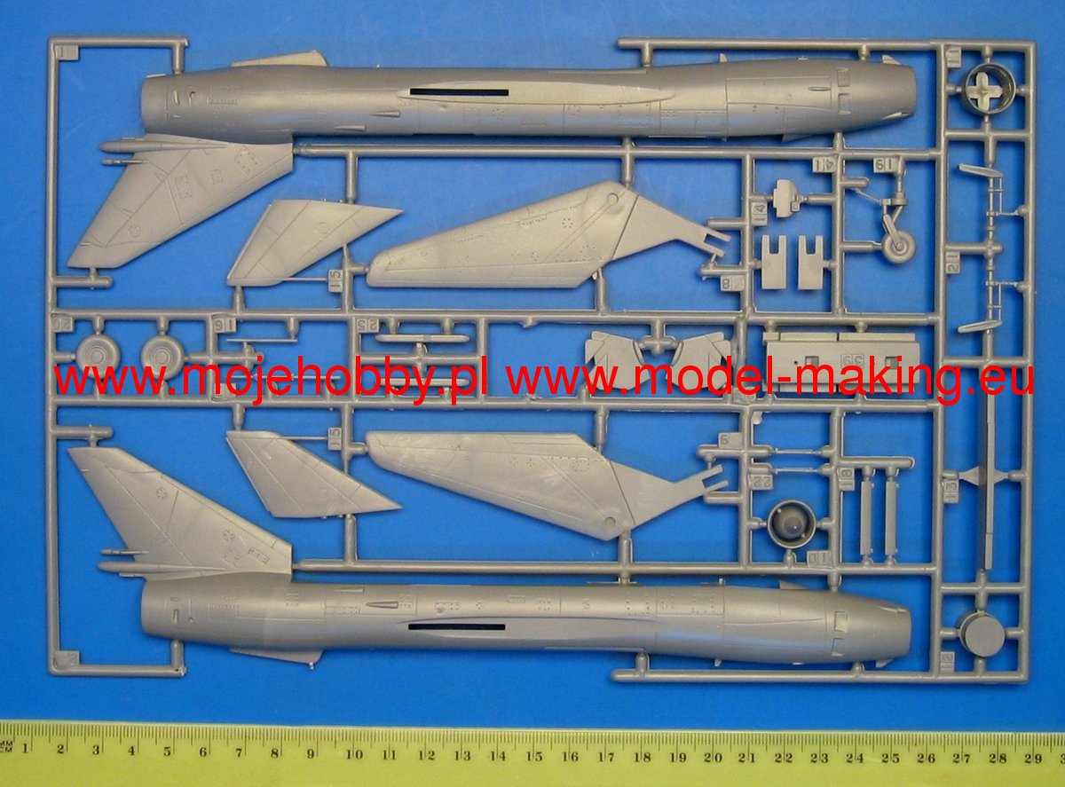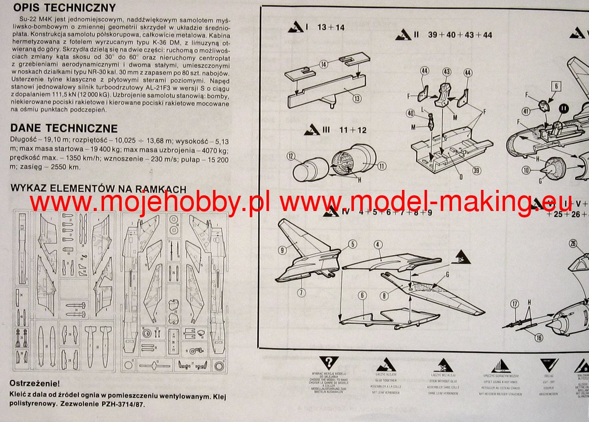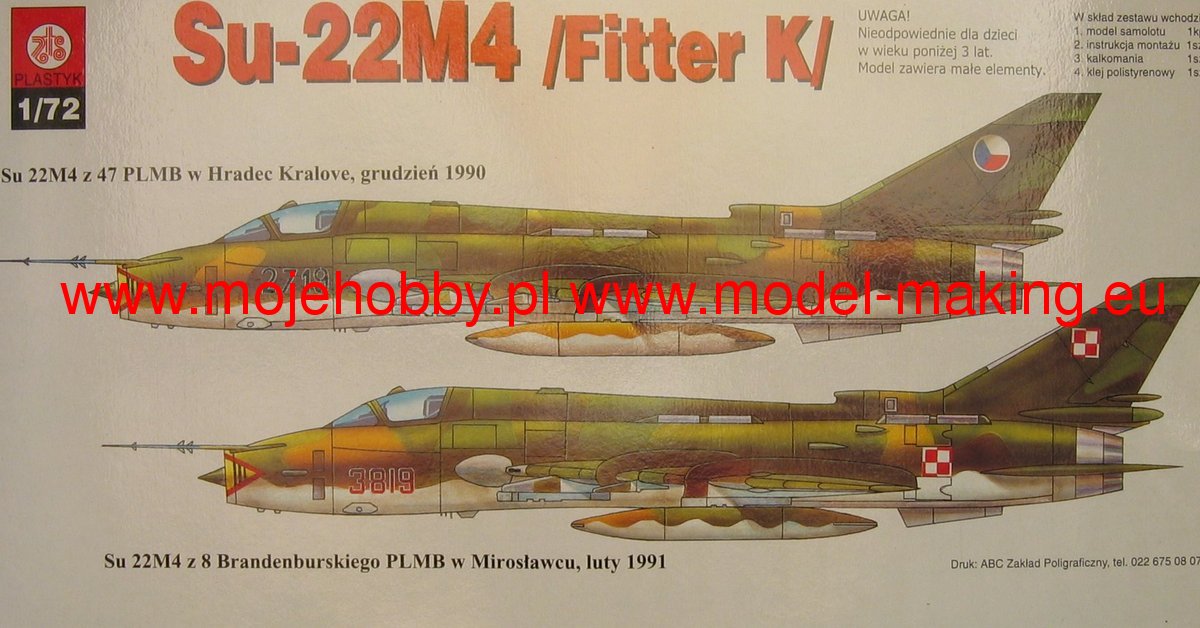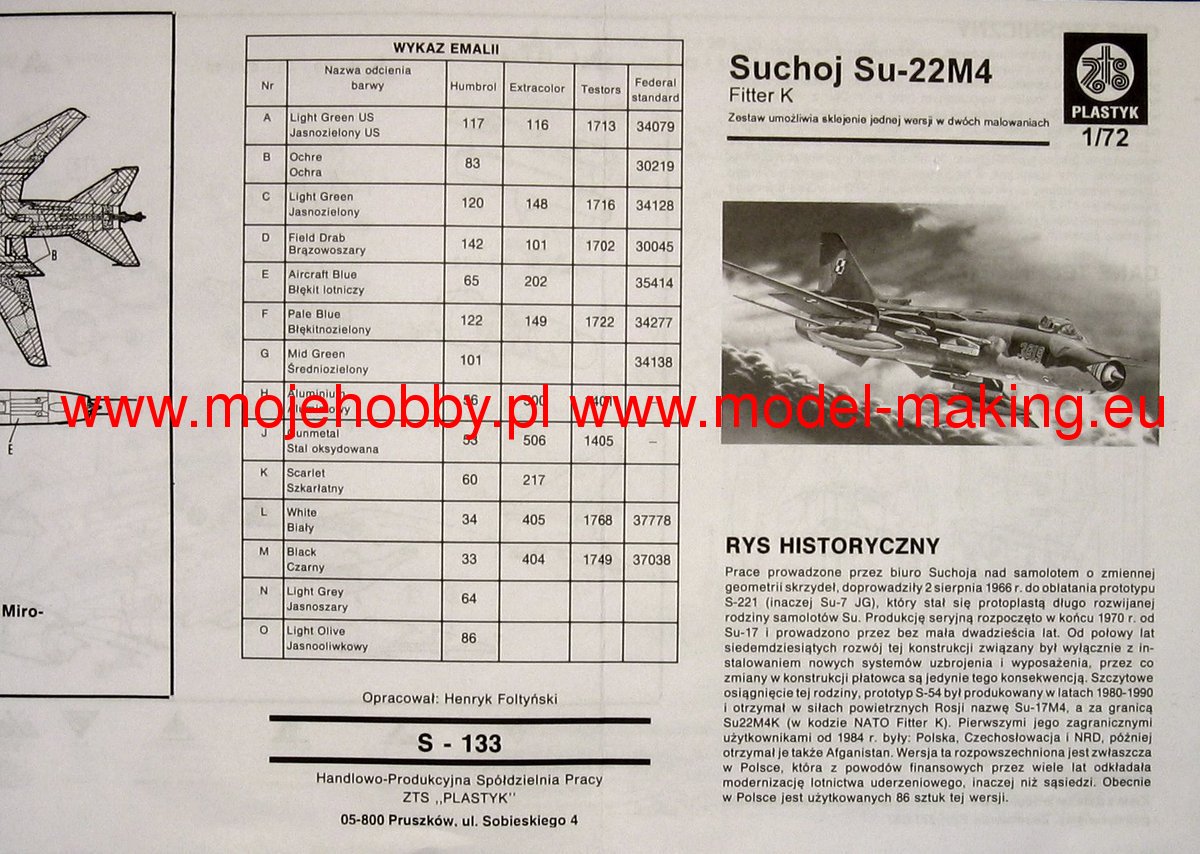 The Sukhoi Su-22 is a Soviet single-engine attack bomber with variable wing geometry, a development of the Su-17 machine, mainly for export. The first export version is the Su-22K, with the Tumański R-29 engine. A two-seater version was quickly created, designated as Su-22M3U. The Su-22M4 model, which was first sold in 1979, was the most sold. It had a significantly modernized avionics with laser devices for distance measurement and targeting (Klon-54 device). It was the standard attack aircraft of the 1980s of the Warsaw Pact countries. Technical data: length: 19.02m, wingspan (with folded wings): 10.02m, height: 5.1m, maximum speed: 1.7Ma, rate of climb: 230m / s, maximum range: 2250km, armament: fixed - 2 NR-30 30mm guns, slung - up to 4070 kg of cargo
