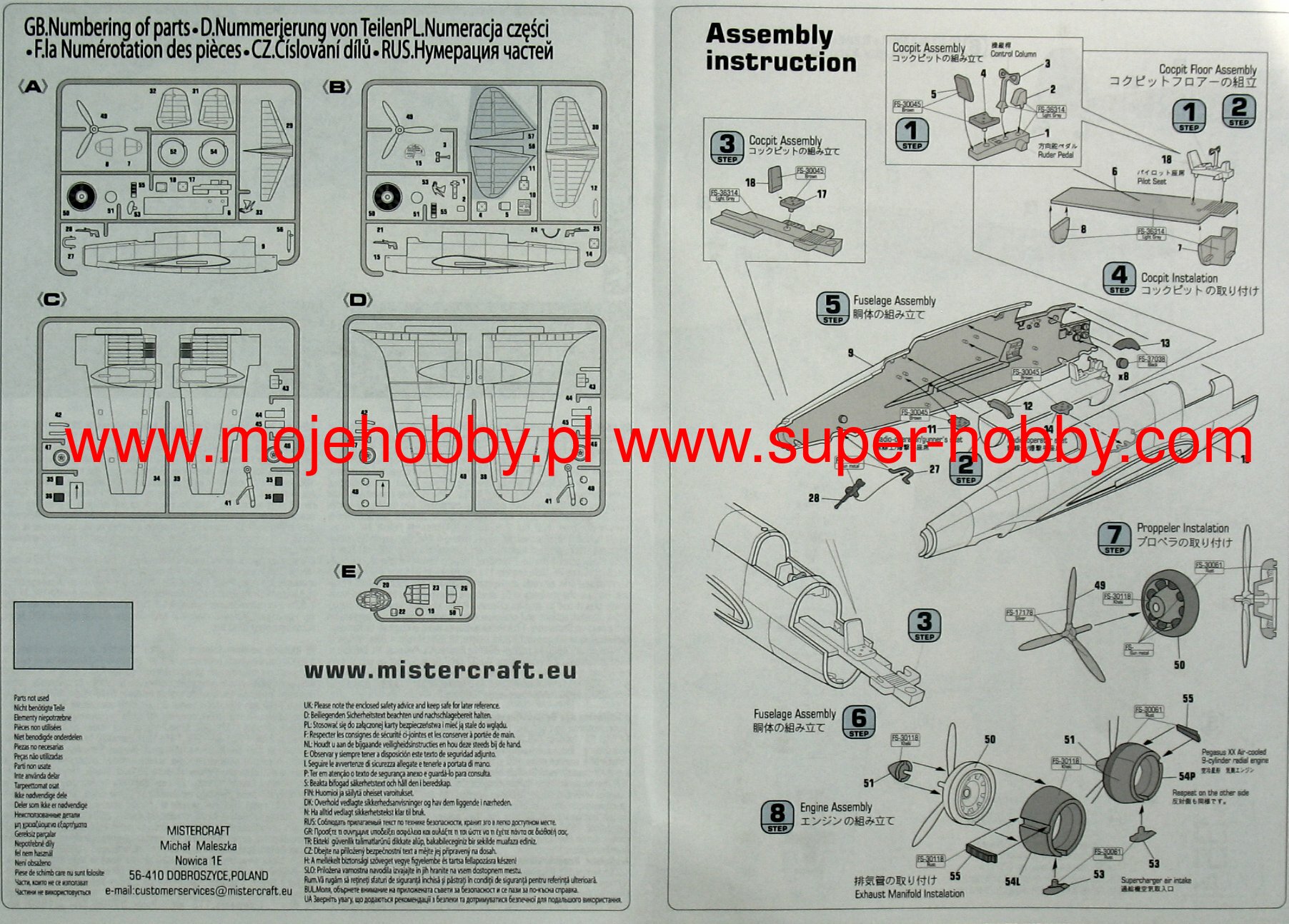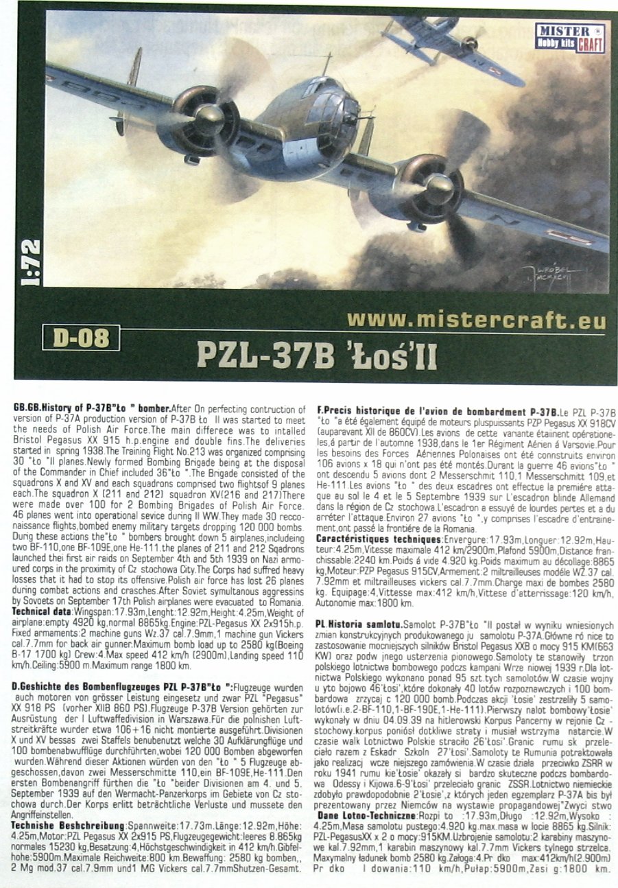 The PZL-37A / B Łoś is a Polish, two-engine low-wing bomber with a full metal structure, with a retractable landing gear. The flight of the prototype took place in December 1936, and serial production continued in 1937-1939. The PZL-37 was the most modern Polish military aircraft built before World War II and the world's first serial aircraft with a laminar wing profile. As a result, it developed a speed in excess of 400 km / h. The plane was among the world's top bombers at the end of the 1930s. By September 1939, 96 Elks had been built, 9 of which were crushed. 40 fought in the Bomb Brigade, while 37 were in the training squadron and in the Aviation Cadet School, and 5 in trials and 5 in repairs. The elk of the Bomb Brigade was fought by the German armored units near Radomsko, Pułtusk and Różan. 23 Łosie were evacuated to Romania, 2 landed in the USSR, 2 were captured by the Germans, and 60 were destroyed. The Romanian air force commandeered Łosie. Romanian characters and numbers from 201 to 220 were painted on them. They were used by Romania, which fought on the side of Germany with the Soviet Union, among others for the bombing of Odessa. Technical data (version B): length: 12.92 m, wingspan: 17.93 m, height: 4.25 m, maximum speed: 412 km / h, practical ceiling: 9250 m, maximum range: 1500 km, armament: fixed - 3 machine guns wz.37 7.92mm caliber, suspended - up to 2580 kg of bombs. Note: Comany Mistercraft frequently changes, without any notice, the decals that come with the model, so they may differ from the photos and descriptions on our website. If you need a specific version, please let us know about that by entering the appropriate notice in the comments field when placing the order.