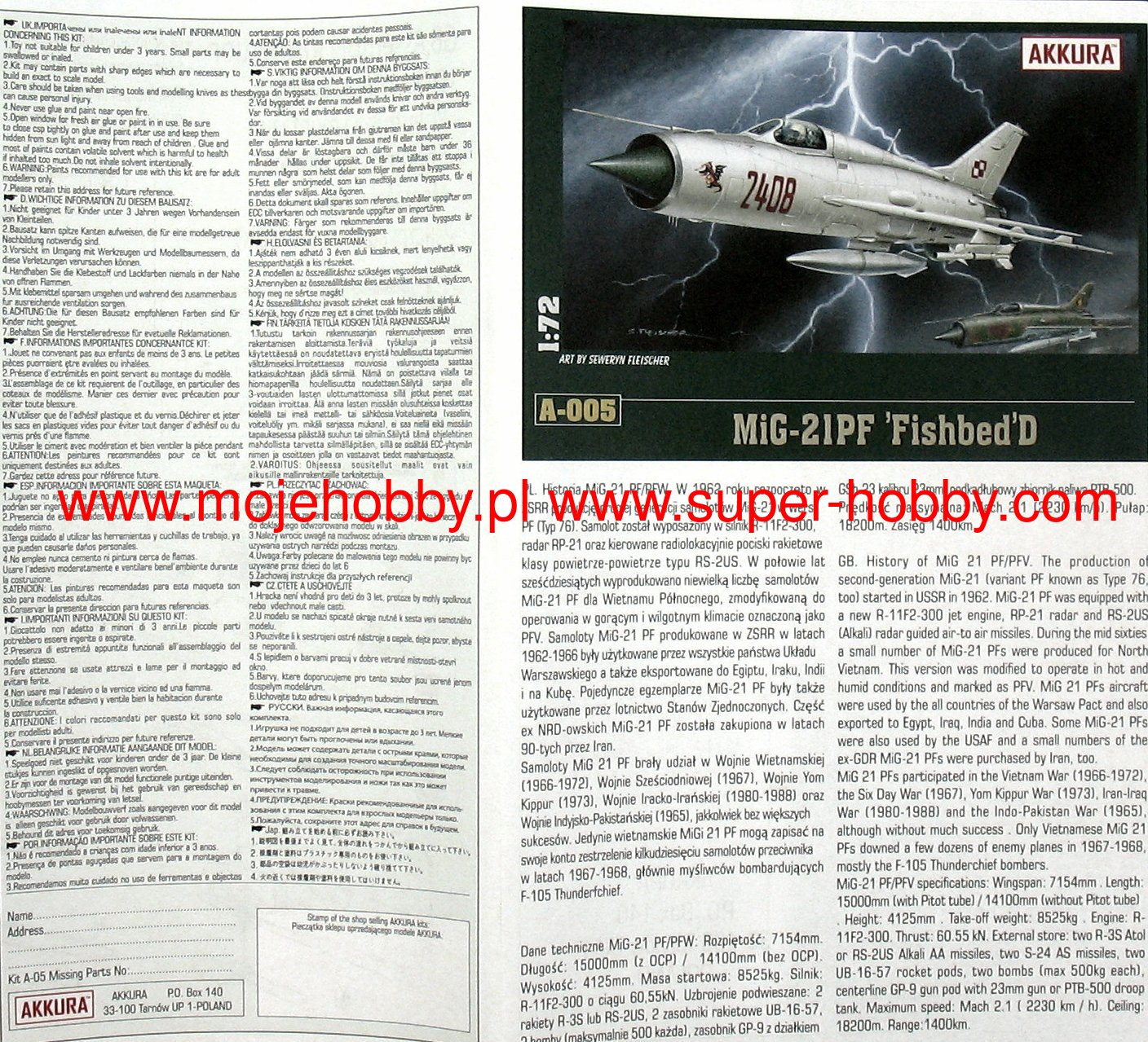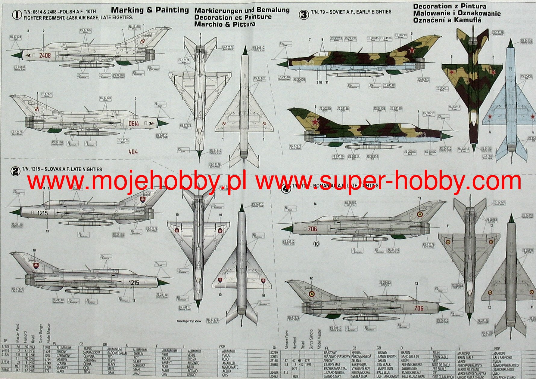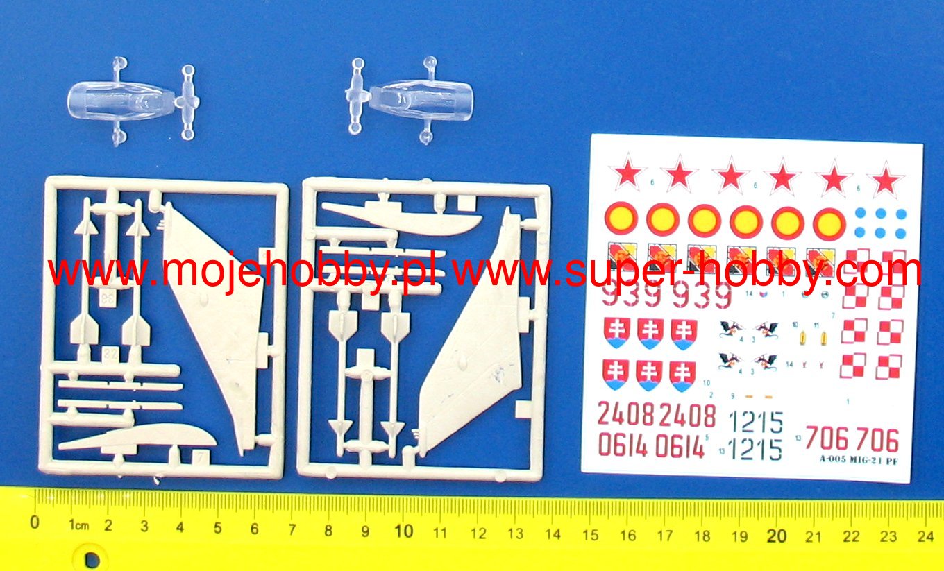 The Mikojan-Guriewicz MIG-21 (NATO: Fishbed) is a Soviet light fighter with a duralumin, half-shell structure, in a mid-wing design, with a delta blade with a 57-degree slope. The prototype flight took place on June 16, 1956. The prototype of the MIG 21 is considered to be the E-5 prototype powered by the RD-11 engine. After its flight, several other prototypes were created, which, incidentally, were breaking various international airspeed records. The experience gained from them was used to improve the E-5, and finally the aircraft was sent to mass production as the MIG-21F-13 in 1959. There are over a dozen basic versions in production, and along with various subversions, the number of MIG 21 types can be estimated at several dozen! The most important of them is the first mass-produced MIG-21F. It replaced the MIG-21PF version with the RP-21 radar and the R-11F2 engine. The next development version is the MiG-21R, i.e. a reconnaissance aircraft. Several training versions were also created, the first of which is the MiG-21U-400. The MIG-21 turned out to be a very successful design, with great performance, easy to pilot and cheap to produce. The quality of the construction is evidenced by the fact that in the 90s there were development versions of this aircraft, which was more than 30 years old. The machine was exported to all countries of the former Warsaw Pact and the entire multitude of Arab and African countries. The MIG-21 took part in most of the armed conflicts of the 1960-1980 period, including in the Vietnam War, in the Six Day War (1967), in the Iran-Iraq War (1980-1988). Technical data: length: 13.46m, wingspan: 7.15m, height: 4.1m, maximum speed: 2130km / h, climb speed: 120m / s, maximum range: 1100km, maximum ceiling 19000m, armament: fixed - single 23 mm GSz-23 cannon (M version), suspended - up to 2000 kg of cargo.