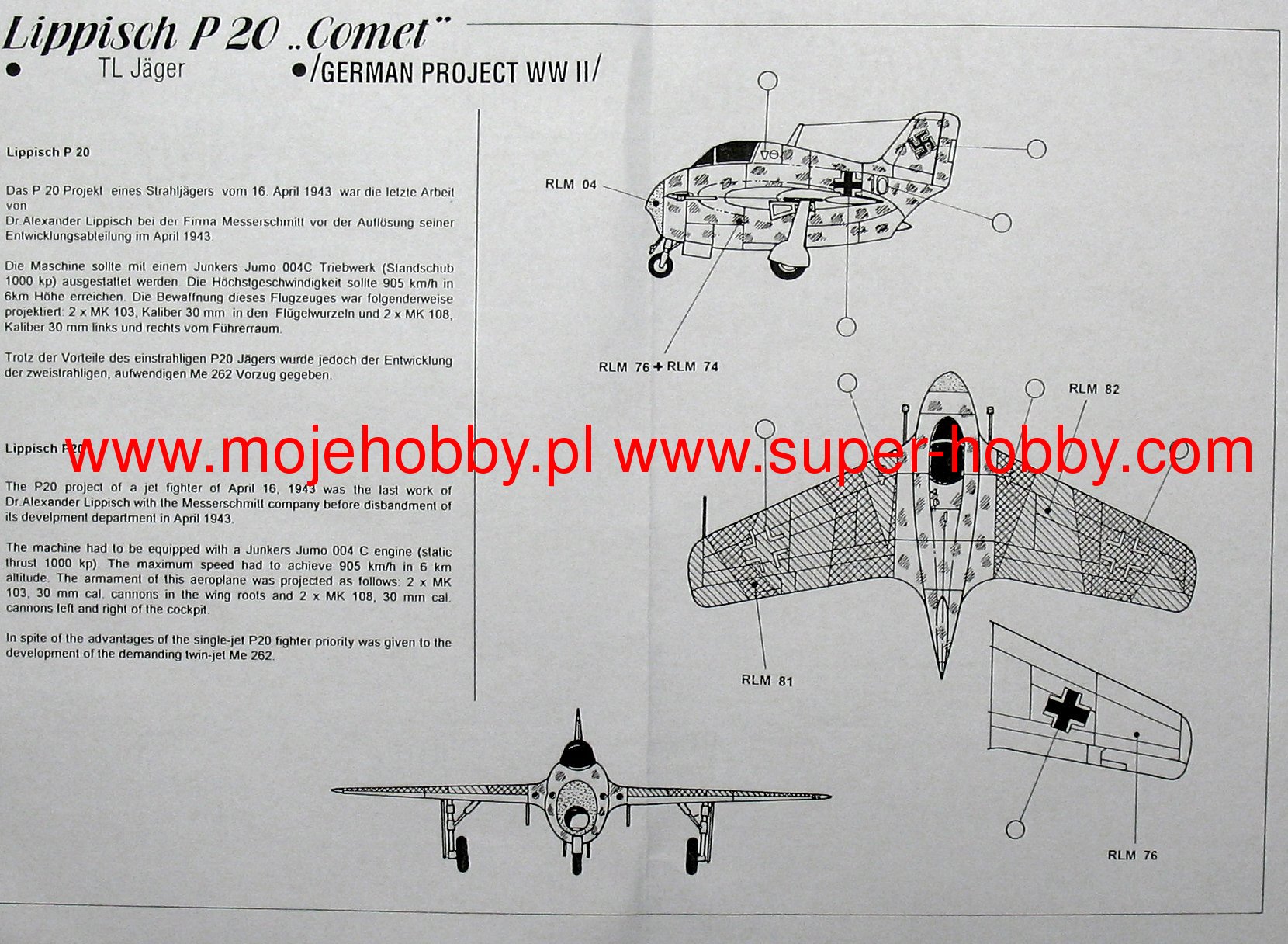 The Lippisch P.20 was a project of a German jet-propelled fighter from the Second World War. The drive was supposed to be provided by a single engine Junkers Jumo 004. The deck armament was to consist of four cannons: two 30 mm Mk.108 and two 30 mm Mk.103 cannons. The plane has never been tested, much less entered mass production. The design of the P.20 aircraft was developed in 1943 by Alexander Lippisch as a far-reaching development of the Messerschmitt Me-163 design. The design of the new fighter with the Me-163 kept the general concept of the aircraft and the relatively small size of the entire structure, but introduced some very important changes. First of all, the Lippisch P.20 was to be powered by a jet engine, not a rocket engine, and it was also to have more powerful on-board weapons. It was also assumed that the new machine would have much greater maneuverability and would be easier to pilot than the Me-163. Ultimately, however, the project was discontinued and the Lippisch P.20 was never flown.