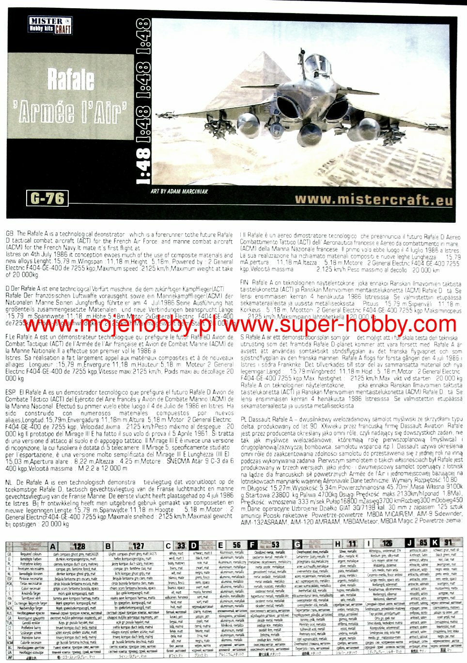 Note: Comany Mistercraft frequently changes, without any notice, the decals that come with the model, so they may differ from the photos and descriptions on our website. If you need a specific version, please let us know about that by entering the appropriate notice in the comments field when placing the order. The Dassault Rafale (French squall) is a French twin-engine multi-role fighter plane with delta wings. Construction of the Rafale was initiated in 1980 by Dassault as an experimental combat aircraft - the ACX. It was to replace the tactical battlefield aircraft of the French air force Jaguar and the French navy Vouhgt F-8E and Dassault Super Etendard. Rafale A, powered by two General Electric F104 turbofan engines, left the assembly line on December 14, 1985, and exceeded the speed of sound in its first flight on July 4, 1986. In April 1987, the plane made several approaches to aircraft carrier Clemenceau to mark an operation from the deck. In April 1989, the new SNECMA M88-2 engine was introduced, which became the basic power unit. The flight of the aircraft in this configuration took place on February 27, 1990. The plane was purchased by India in 2012, so far (2013) other countries apart from India and France have not acquired the plane. Technical data: length: 15.27 m, wingspan: 10.8 m, height: 5.34 m, maximum speed: 2130 km / h, climb speed: 305 m / s, practical ceiling: 16 800 m, maximum range: over 3700 km, armament: fixed - 1 GIAT 30 cannon, cal.30 mm, suspended - up to 9500 kg of cargo.