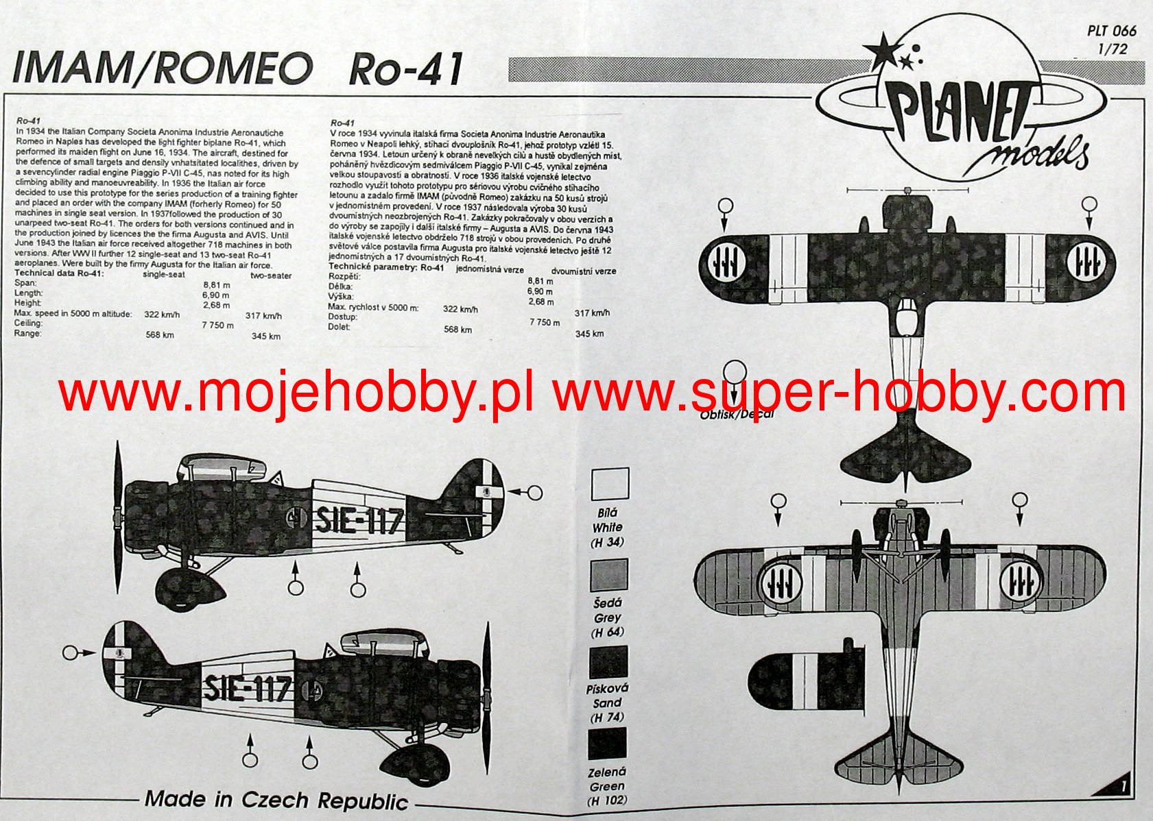 The IMAM Ro.41 was an Italian fighter and training aircraft in a mixed biplane structure with a fixed landing gear. The drive in the basic version was provided by a single engine Piaggio P. VII C. with 390 hp . The prototype flight took place in 1934. Serial production began in 1935, which led to the creation of about 740 copies of this aircraft. It was armed with two 7.7 mm Breda-SAFAT machine guns. The Ro.41 plane was created as a private initiative of the IMAM aviation plant, which in 1935 was taken over by the Breda concern. Despite the takeover, work on the Ro.41 continued with the goal of creating a new, maneuverable fighter for the Italian Air Force (owned by Regio Aeronautica). However, despite the corrections and structural changes introduced in the course of design works, the Ro.41 turned out to be a not very successful fighter. It was true that it had a better rate of climb and maneuverability than the standard Italian fighter of that time, i.e. the Fiat CR.32, but it was clearly inferior to it in terms of flight range, maximum speed, the amount of weapons carried and diving skills. Despite these drawbacks, the Ro.41 was commissioned by the Italian Air Force, but as an advanced training aircraft and light fighter. Aircraft of this type took part in the course of the Spanish Civil War (1936-1939) and was completely symbolic in World War II. Copies that survived the war served in the Italian air force until 1950.