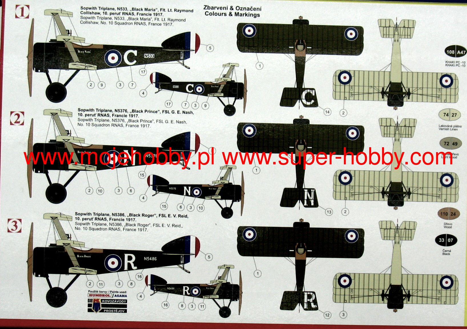 Sopwith Triplane британский одномоторный трехлопастной истребитель со смешанной конструкцией времен Первой мировой войны. 28 мая 1916 года экспериментальный отдел Sopwith спустил на воду свой первый триплан. Технические данные указывали на то, что машина очень маневренная и быстрая. Компания Sopwith вскоре запустила этот самолет в серийное производство. Он был оснащен двигателем Clerget 9B мощностью 132 л.с. и назывался просто Триплан Sopwith Triplane. Английский самолет вызвал большой интерес у немецкой стороны и оказался для нее настоящим шоком. Самолет прослужил на фронте с конца 1916 до осени 1917 года, уступив место знаменитому Sopwith Camel. Технические данные: длина: 5,73 м, размах крыла: 8 м, высота: 3,2 м, максимальная скорость: 187 км/ч, скорость набора высоты: 5,2 м/с, практический потолок: 6200 м, вооружение: стационарное - 1 пулемет Vickers кал.7,7 мм.