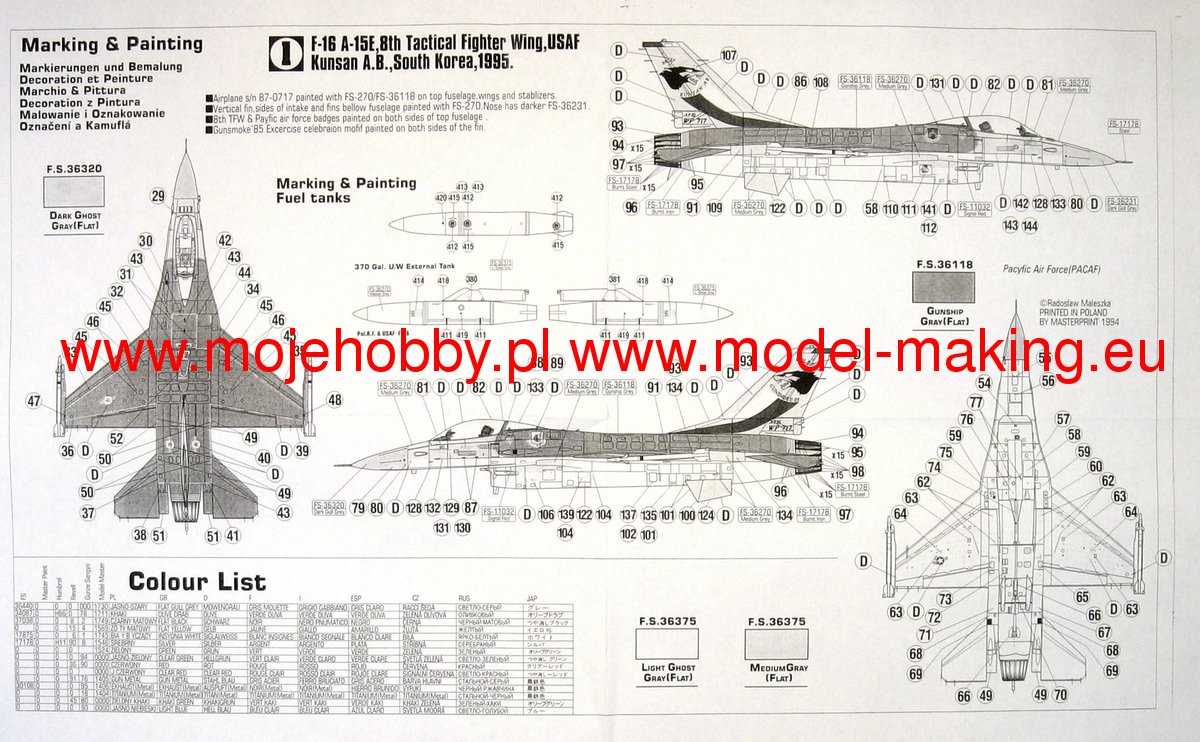 Note: Comany Mistercraft frequently changes, without any notice, the decals that come with the model, so they may differ from the photos and descriptions on our website. If you need a specific version, please let us know about that by entering the appropriate notice in the comments field when placing the order. The General-Dynamics F16 Falcon is an American single-engine, multi-role light fighter and stormtrooper. Work on the F-16 project began in 1971 at the General Dynamics concern (which in 1993 was part of the Lockheed Martin giant), entering the competition for a light multi-purpose fighter (LWF) for the US Air Force. The YF-16 prototype first flew on February 2, 1974. A breakthrough in technical terms was the use of a computerized electric fly-by-wire control system, which made it possible to reduce the area of the wings and tail, and thus reduce the weight of the entire aircraft. The F-16 was the first fighter in the world to use such a system. The first versions were to a large extent made of aluminum alloys (about 83% of the total structure), but with time they gave way to composites. The different versions of the F-16 are powered by three versions of the engines: Pratt-Whitney F-100-PW-200, General Electric F110-GE100 and Pratt-Whitney F-100-PW-2020. The "brain" of the guidance system was the APG-66 radar, later replaced by the APG-68 (V) radar. It is worth noting that the YF-16 design turned out to be so successful that it won not only the LWF competition in the USA (in competition with the Northrop YF-17 aircraft), but also won the centenary contract for a multi-role fighter for European NATO countries. His rivals were the Dassault Mirage F.1 and SAAB J-37 Viggen machines. Serial production of the F-16 began in 1975. It was also attended by European NATO countries for which it was an injection of new aviation technologies. Final assembly was performed in the USA, Belgium and the Netherlands. The first serial F-16A Fighting Falcon was flown on August 7, 1978. It is an assault version of the F-16, intended primarily to counter ground targets. The F-16 also proved itself in combat, with a series of air victories in the war in Lebanon (1982) and during the Operation Desert Storm (1991). By the end of the 20th century, more than 4,000 of this successful aircraft had been produced. There were six basic versions of the F-16, marked as A, C, E (single-seater) and B, D, F (two-seater). On the basis of these six models, numerous upgrades are created, most often associated with the replacement of avionics, marked as "Block". Since 2006, the F-16 also serves in the Polish aviation. The Polish Ministry of Defense decided that the F-16 would be the backbone of the modernized air force, rejecting offers from Dessault and SAAB, although in this case they were Mirrage F2000 and JAS-39 Grippen fighters. Undoubtedly, the highest sum proposed by the American company as part of the so-called offset transaction. Technical data: Maximum speed: 2,170 km / h, rate of climb: 254 m / s, maximum ceiling 15240m, maximum range: 3890km, armament: fixed - one 20mm six-barrel M61A-1 cannon, suspended - up to 9275 kg of cargo.