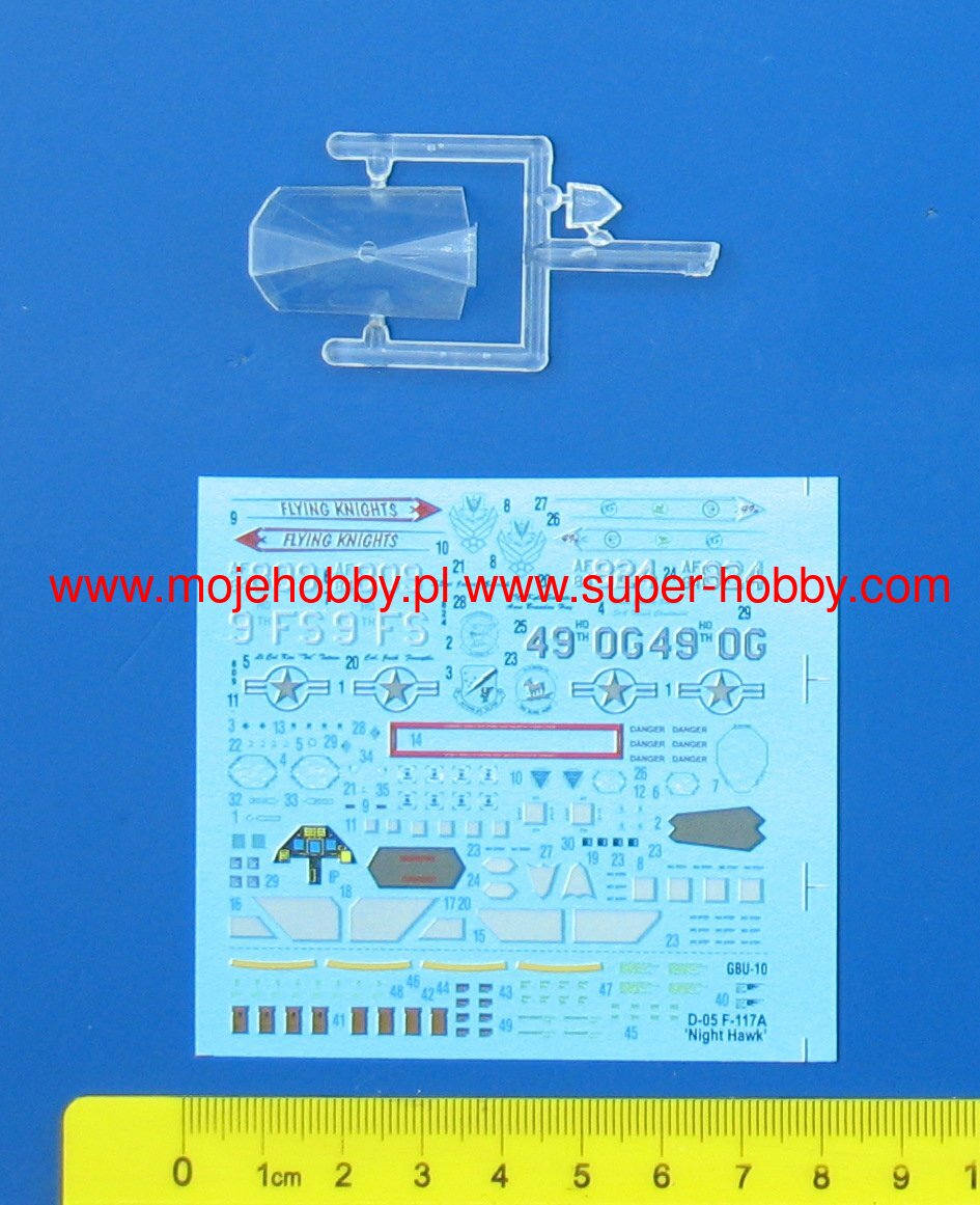 Note: Comany Mistercraft frequently changes, without any notice, the decals that come with the model, so they may differ from the photos and descriptions on our website. If you need a specific version, please let us know about that by entering the appropriate notice in the comments field when placing the order. The Lockheed F-117 Nighthawk is one of the most innovative designs in the history of aviation and the first mass-produced aircraft with Stealth properties. The concept of an aircraft invisible to radars appeared already during World War II, but it was not until the 1970s that the development of technology made it possible to implement it. In the F-117 it was achieved thanks to the use of many parallel actions. First of all, an unprecedented aerodynamically shape of the plane with a slender pentagonal profile with many flat surfaces with Rudlicki's tail was used. The plane is covered with special RAM (Radar Absorbent Material) materials that "absorb" radar waves. All external elements and the shape of the cabins have been carefully refined, and the active means of detection have also been abandoned. The engines (two General Electric F404-GE-F1D2 turbofans) were also completely muted and isolated from each other. The result was a Stealth bomber that was ideal for destroying enemy radar stations. The history of the F-117 dates back to 1977, when the first pre-prototype was demonstrated, and mass production started in 1981. The planes achieved combat readiness two years later. By 1991, 59 F-117As had been produced. All weapons are carried in the bomb bay, most often these are laser guided GBU-27A Paveway III bombs, AGM-65 Maverick air-to-ground missiles or AGM-130 missiles. The F-117A was used in combat in Panama in 1989 and, above all, during Operation Desert Storm in 1991, in which it demonstrated astonishing effectiveness, during Operation Allied Force in 1999 and in the war in Afghanistan (2001-2002) and Iraq (2003). In 2008, the F-117 was officially withdrawn from the line. Technical data: Maximum speed: 1040 km / h, operating ceiling 13 700 m, maximum range: 1850 km, armament: fixed - the aircraft has no fixed armament.
