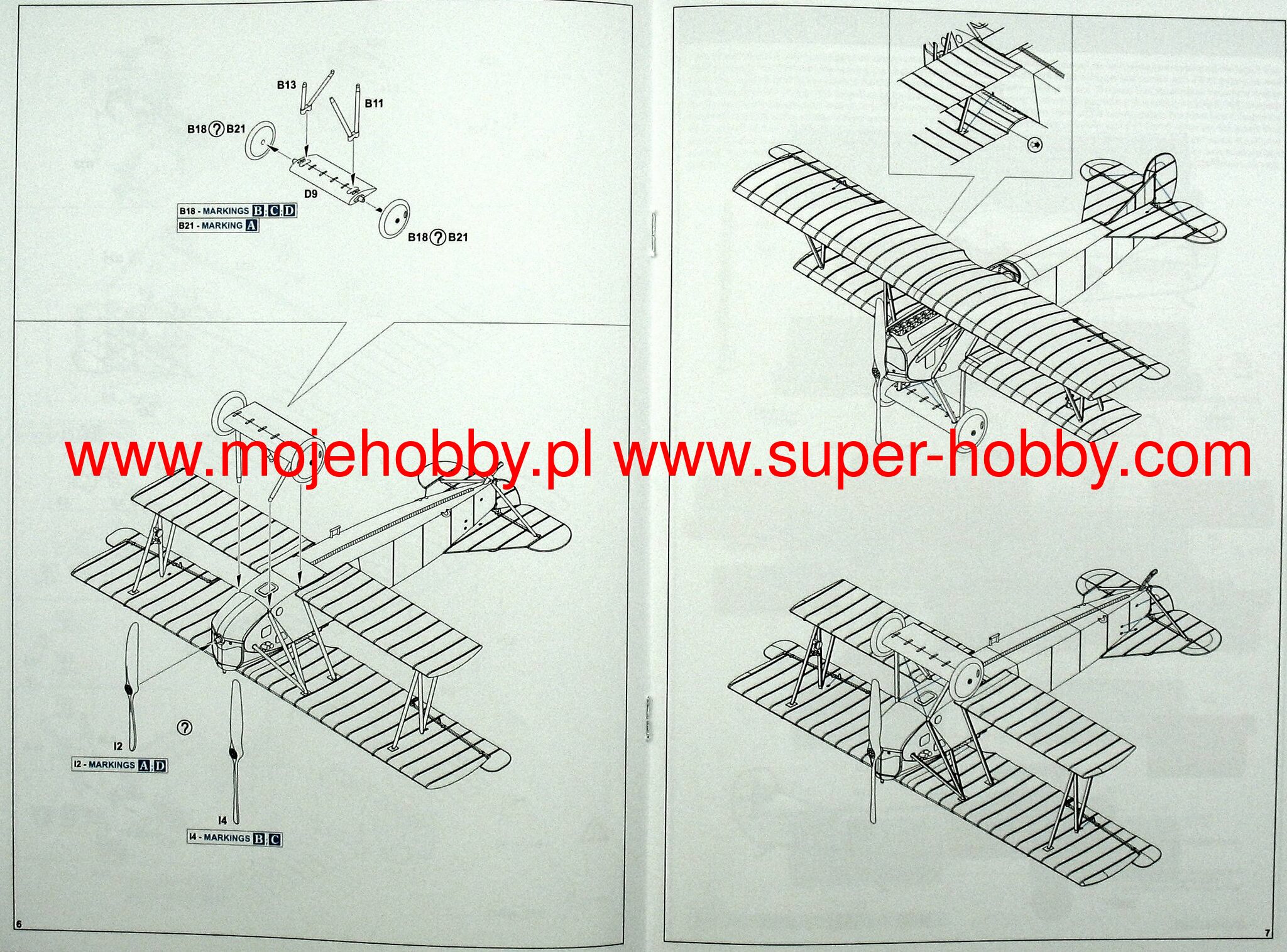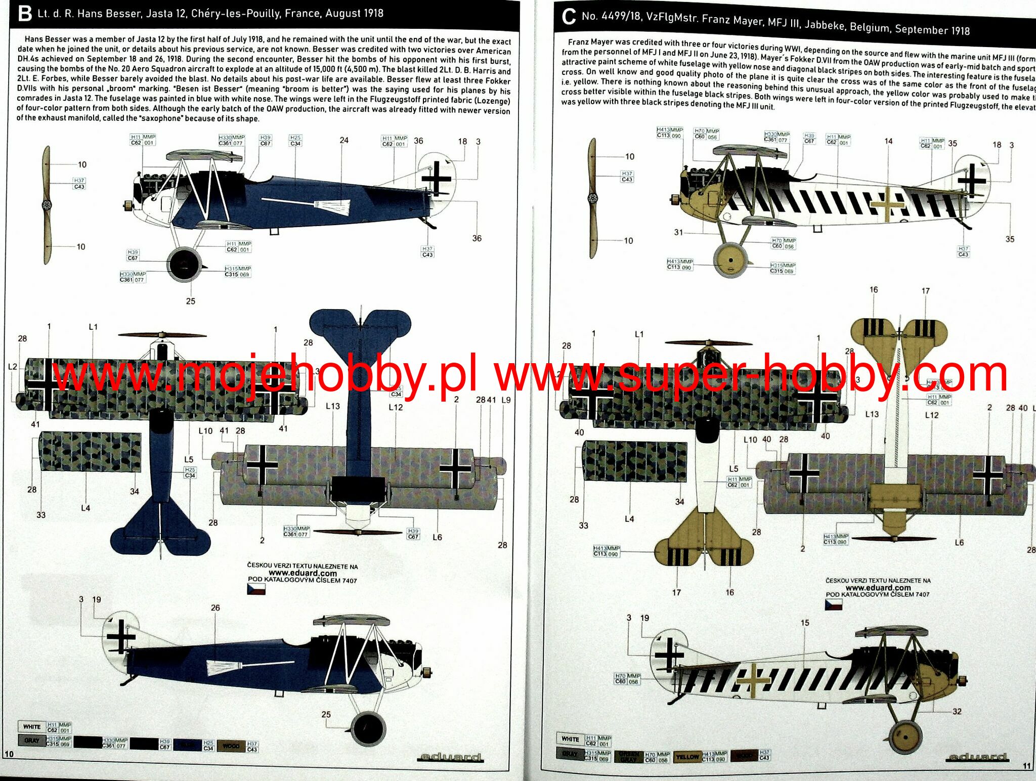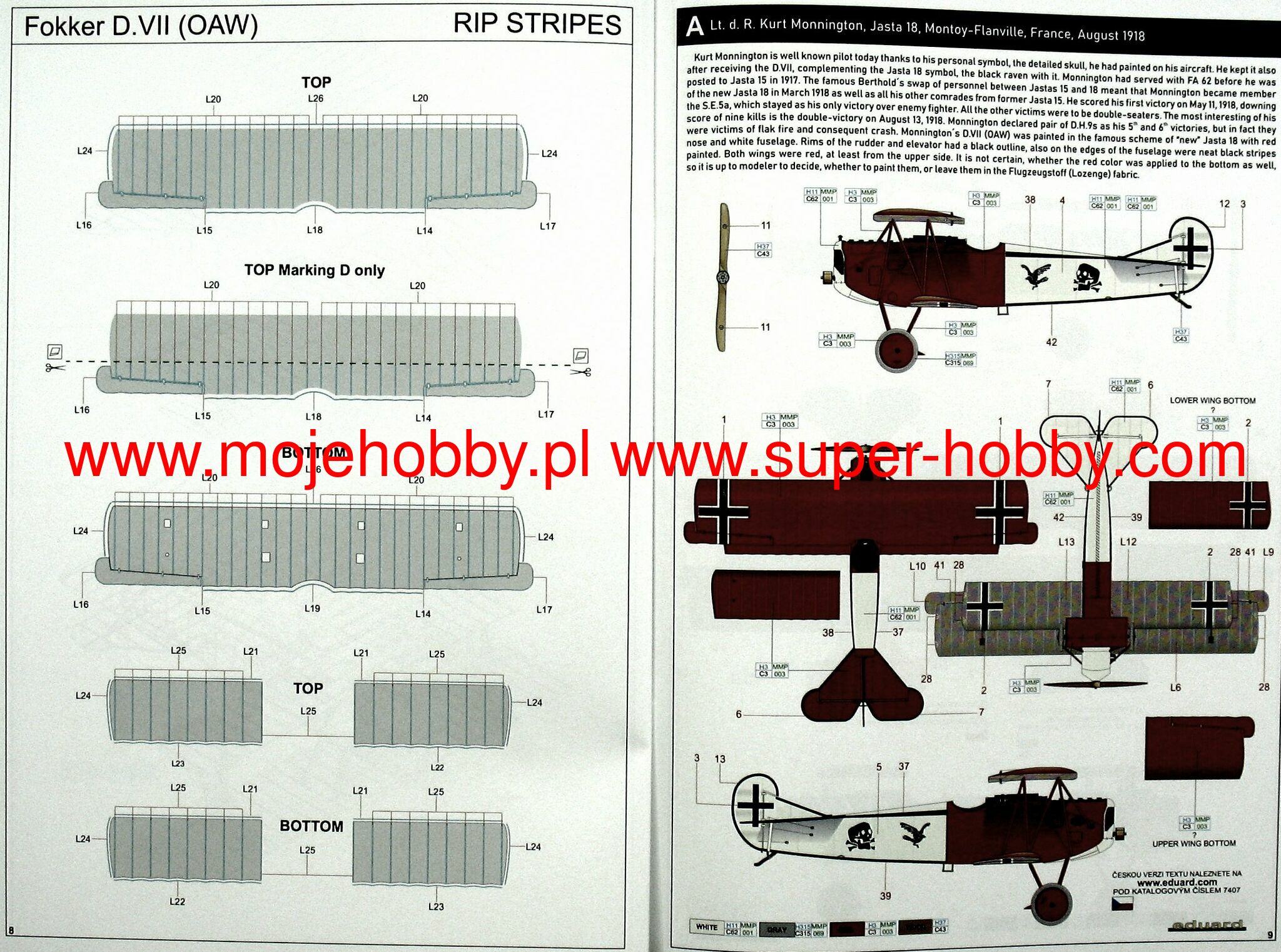 The Fokker D.VII is a German biplane fighter with a mixed structure (plywood, canvas, aluminum) from the end of the First World War. The flight of the prototype took place in January 1918, and in May of the same year, the plane entered service in the air. The Fokker D VII quickly demonstrated its superiority over the Allied aircraft. It had higher acceleration and a higher ceiling, which, combined with very good control devices, made the German pilots able to defeat 565 Allied machines in August 1918. Designed by Reinhold Platz, D VII was selected from among many other designs during the competition between January-February 1918. Baron Manfred von Richthofen (known as the "Red Baron") himself flew a prototype marked with the code V11. He later stated that the plane was easy to navigate, had a good climb rate, and was suited to "dive" flights in which the Fokker was found to be "rock hard". Other pilots also emphasized good visibility from the cockpit. The plane was of a mixed construction. The rectangular hull was made of welded steel pipes with a cloth cover. Only the nose of the fuselage housing the engine had removable side covers made of aluminum sheet. Double-girder panels, connected with each other by thin N-shaped stands, free-bearing with a thick profile, covered with plywood up to the first girder, the rest with canvas. The plane used Mercedes D.IIIa (180-200HP) or BMW IIIa 185HP engines as the drive. The BMW engine was a much better power unit, but as a result of limited production, the Mercedes engine was used on a much larger scale. It is worth noting that the Fokker D.VII flew min. Herman Goring, who achieved many air victories on it. The quality of the machine can be proved by the fact that it was produced until 1926. Technical data (for the version with the BMW-Fokker D.VIIF engine): length: 6.95 m, wingspan: 8.9 m, height: 2.75 m, maximum speed: 200 km / h, climb speed: 9, 52 m / s, maximum ceiling 6000 m, armament: fixed - 2 LMG 08/15 machine guns, cal. 7.92 mm. 3_edu7407_instruction_sheet.pdf
