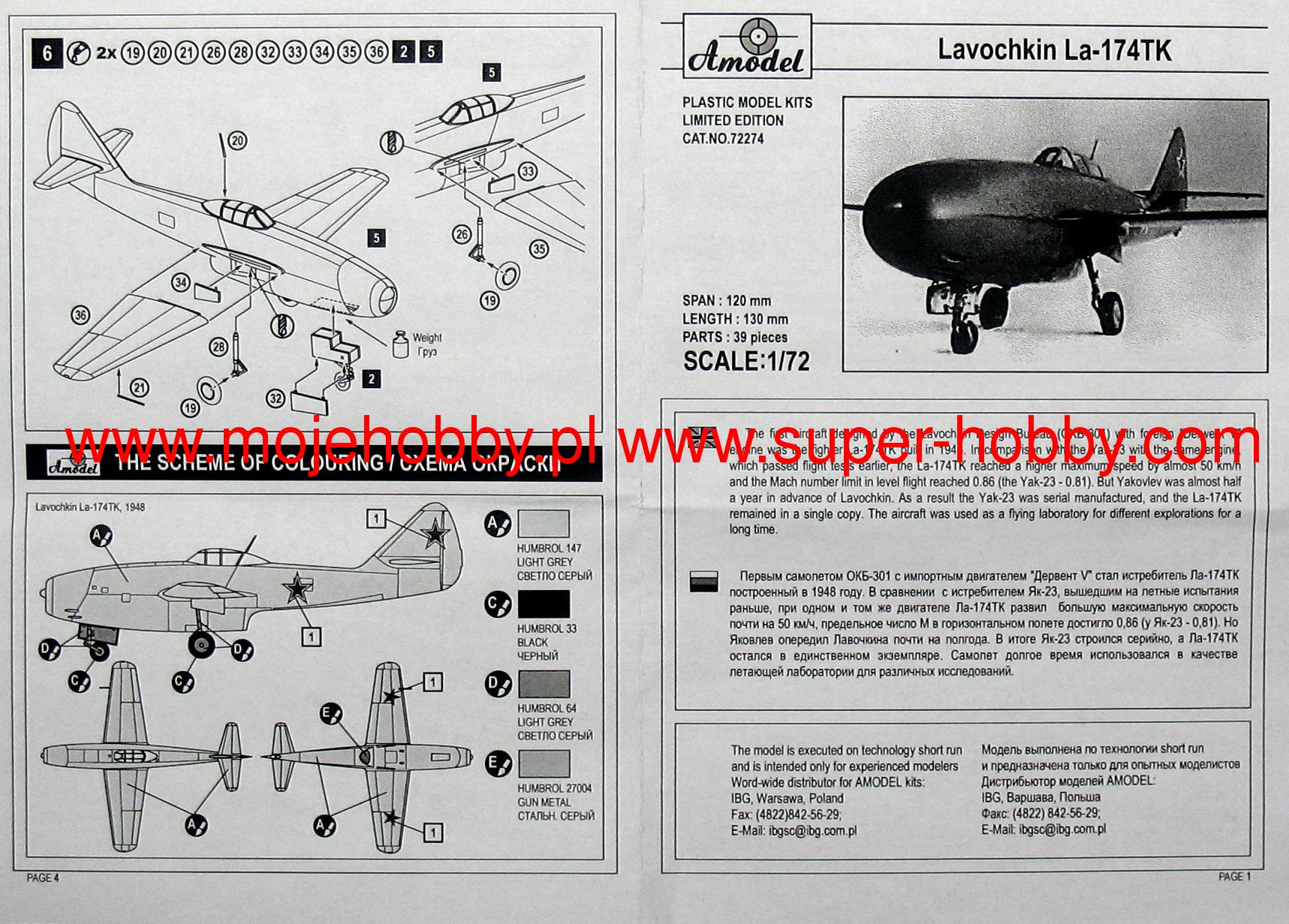The Lavochkin La-174TK was a Soviet mid-wing prototype fighter from the post-war period. The prototype's flight took place in 1948, but the machine never entered mass production. The drive was provided by a single turbojet engine with a Rolls-Royce Derwent IV centrifugal compressor (Klimov RD-500). The deck armament was to consist of three 23mm NS-23 cannons. The Lavochkin La-174TK was designed as the Soviet Air Force's new entry-level fighter and competed with the Yak-23. The Lavochkin design bureau decided to base the design of the new machine on the prototypes of the La-152 and - especially - the La-154 fighters. However, in its design, a completely new turbojet engine was used and very thin wings were used, while continuing the redan layout (engine in the nose of the fuselage with the outlet nozzle below it) of the entire structure. Despite the fact that the La-174 TK had a good thrust-to-weight ratio and a high maximum speed, it did not enter serial production, because it was beaten by the Yak-23, and especially by the MiG 15.