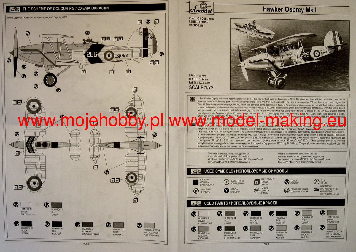 The Hawker Osprey was a British seaplane or seaplane reconnaissance biplane from the interwar period. Serial production of the machine started in 1932. In versions Mk. I and Mk. II, the drive was provided by a single engine Rolls Royce Kestrel IIMS with a power of 630 hp. The machine was 8.95 meters long with a wingspan of 11.29 meters. The maximum speed was approx. 235 km / h. The deck armament could consist of two 7.7 mm machine guns. The machine could also carry a load of bombs weighing up to 118 kilograms. The Hawker Osprey was developed as a development of the successful Hawker Hart aircraft. Compared to its predecessor, it had primarily a reinforced structure, but also a special hook enabling it to operate from the decks of aircraft carriers. Four main versions of the aircraft were made in the course of production: the Mk. I (basic version), Mk. II (version with a different float chassis), Mk. III (version with a new propeller) or the Mk. IV (version with a new engine Rolls Royce Kestrel V). Airplanes Hawker Osprey were stationed on such vessels as, for example, HMS Eagle or HMS Hermes. The machines, however, were withdrawn from the front line by 1939. Apart from Great Britain, the planes were operated in Portugal and Sweden.