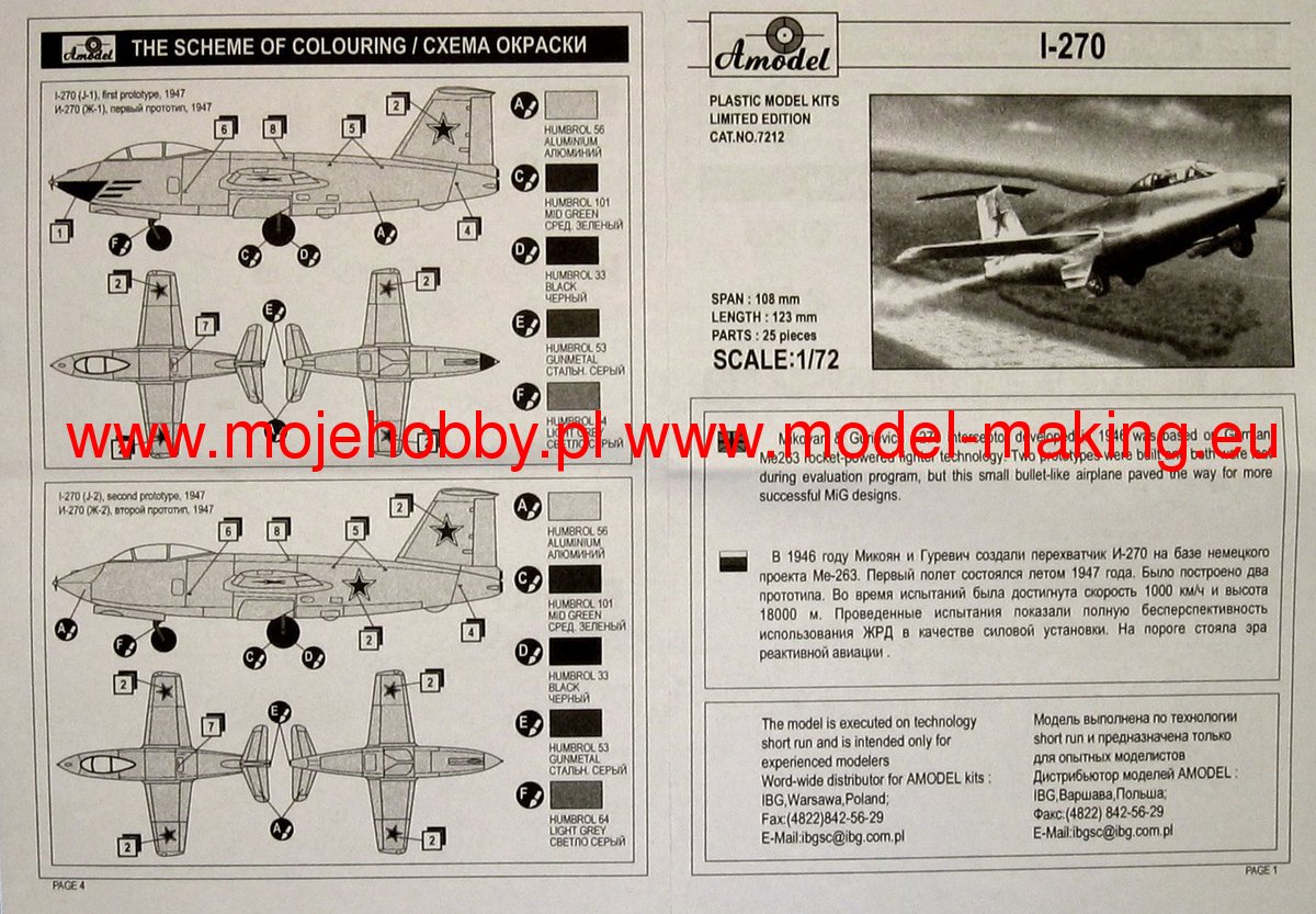 The Mikoyan I-270 was a Soviet prototype fighter aircraft from the Cold War period. The machine was made in a top wing configuration with a landing gear retracted in flight in a three-support configuration. The prototype's flight took place in 1946, but the machine never entered production. The length of this aircraft was 8.92 meters with a wingspan of 7.75 meters. The propulsion was to be provided by a single RD-2 M3V rocket engine with a thrust of 14.2 kN. It was assumed that the on-board armament would consist of two 23mm NS-23 cannons. The Mikoyan I-270 was developed for the Soviet Air Force, which wanted to acquire a new missile-powered interceptor designed to defend strategically important points and areas in the USSR. The machine focuses on the highest possible maximum speed and the best possible rate of climb. The I-270 aircraft in its general concept and aerodynamic system used the experience of working on the RP-318 or Bereziak-Isajew BI-1 machines. In the course of the tests, only two prototypes of this aircraft were created, both of which crashed, which greatly contributed to the abandonment of this project.
