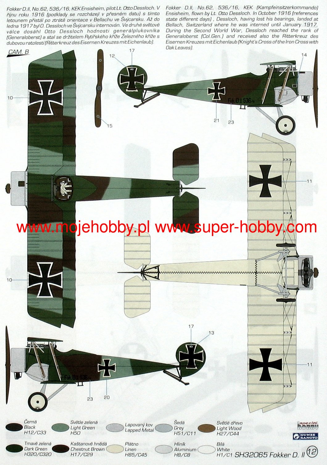 The Fokker D.II is a German biplane fighter designed and put into service in 1916. The Fokker D.II was characterized by a mixed structure: wood and canvas, with the hull formed by a metal frame covered with linen. It was a German response to the Allied Nieuport 11 machines. It was powered by a 100HP Oberursel UI rotary engine. From the summer of 1916, the Fokker D.II began to be part of the specialized fighter squadrons (Jasta). D.II was not a very successful design, it was characterized by not the best maximum speed and climb time. For these reasons, it was quickly replaced by the Fokkers D.III and Albatroses DI. 132 copies were made during the war. Technical data: Maximum speed: 150 km / h, rate of climb: 4.17 m / s, maximum ceiling 4000 m, maximum range: 200 km, armament: fixed - 1 MG08 7.92mm machine gun.