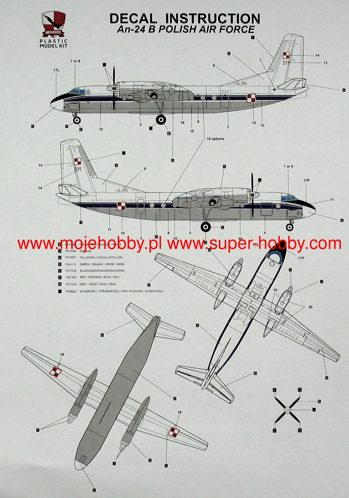Antonow An-24 był radzieckim, dwusilnikowym samolotem pasażerskim i transportowym w układzie górnopłata z okresu Zimnej Wojny. Napęd zapewniały dwa silniki turbośmigłowe Iwczenko AI-24T o mocy 2820 KM każdy. Oblot prototypu miał miejsce w 1959 roku, a produkcja seryjna trwała w latach 1959-1979. W sumie powstało ok. 1370 samolotów tego typu wszystkich wersji. Antonow An-24 został opracowany w celu zastąpienia w lotnictwie cywilnym i wojskowym coraz bardziej przestarzałych maszyn Ił-14. W stosunku do swego poprzednika nowy samolot cechował się innym układem skrzydeł, zastosowaniem nowych, wydajniejszych silników, znacznie lepszej awioniki i sprzętu łączności. An-24 wymagał również znacznie mniej czasu do przeprowadzenia przeglądu technicznego i został dostosowany do operowania z lotnisk o słabej infrastrukturze. W toku produkcji powstało wiele wersji rozwojowych samolotu między innymi: An-24 (wersja podstawowa), An-24B (wersja o powiększonej kabinie pasażerskiej), An-24T (wersja transportowa) czy An-24P (samolot pożarniczy). Wiele maszyn tego typu pozostaje nadal w służbie. Co oprócz modelu będę potrzebować do jego sklejenia?