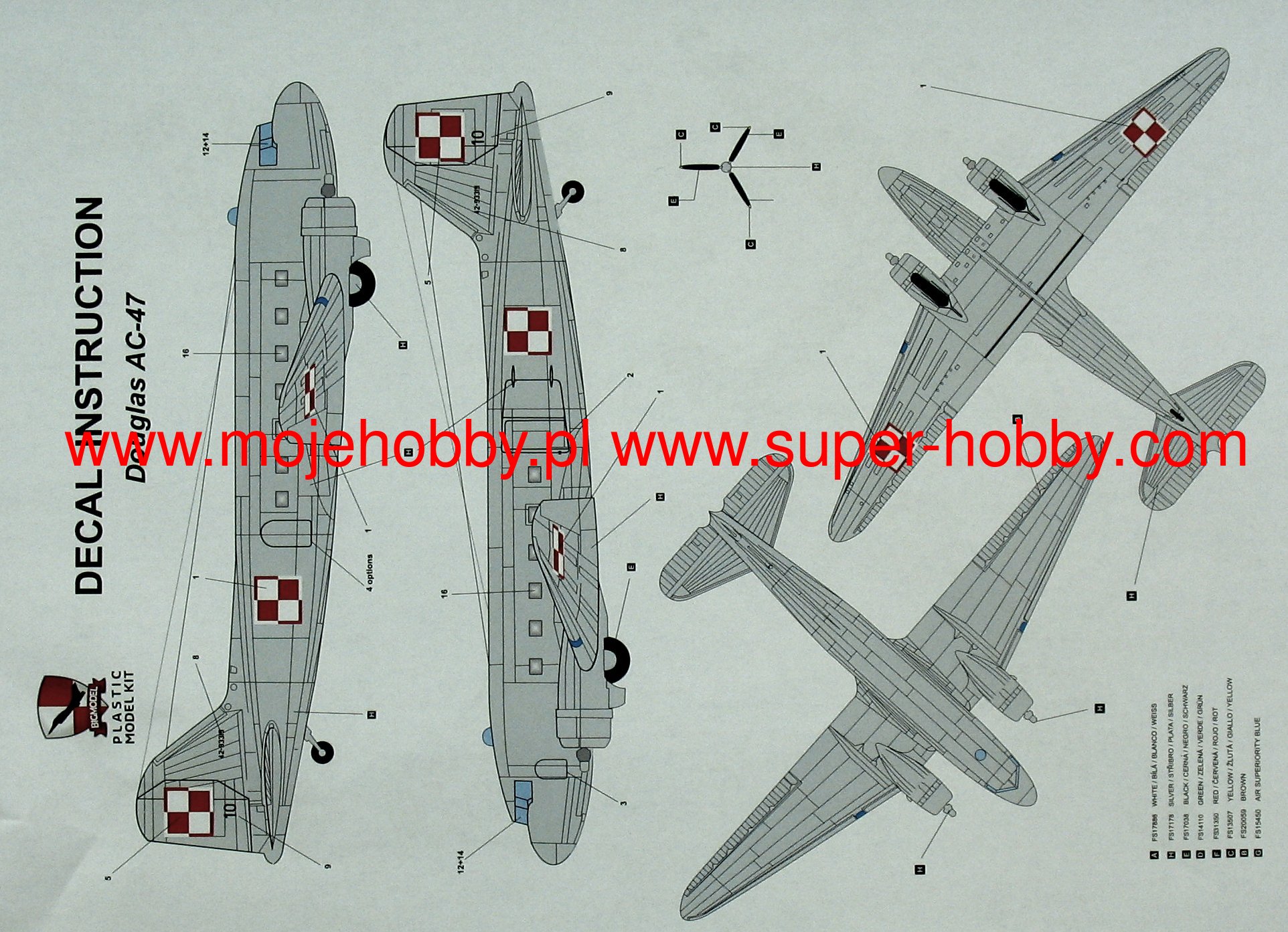 Douglas C-47 Skytrain (lub Dakota) to amerykański dwusilnikowy samolot transportowy o konstrukcji w pełni metalowej z okresu II wojny wiatowej. Był bardzo udanš adaptacjš do celów wojskowych samolotu Douglas DC-3. Data oblotu prototypu C-47 miała miejsce 23 grudnia 1941 roku. Już od stycznia 1942 r. ruszyła produkcja seryjna, która zakończyła się wytworzeniem do końca 1945 roku ponad 10000 egzemplarzy tego samolotu. Podstawowš jednostkę napędowš stanowiły dwa silniki Pratt-Whitney R-1830-92 o mocy 1200KM każdy. Powstało kilkanacie wersji C-47, z których na największš skalę produkowano wersję A (wzmocniona kabina, instalacja elektryczna 24V w samolocie) i B (mocniejsze silniki). C-47 walczyły na wszystkich frontach II wojny wiatowej pełnišc rolę samolotu transportowego, ewakuacji rannych, specjalistycznego do zrzutu spadochroniarzy czy holowania szybowców. Samoloty te wyeksportowano również do ZSRR w ramach Land-Lease Act, a sam Zwišzek Sowiecki w latach 1939-1952 zbudował na licencji ponad 6000 sztuk (jako Li-2). Po 1945 roku samoloty masowo trafiły do cywila stajšc się najpopularniejszym samolotem pasażerskim i transportowym na wiecie. Dane techniczne: Prędkoć maksymalna: 326 km/h, prędkoć wznoszenia: 5,7 m/s, pułap maksymalny 7170 m, zasięg maksymalny: 2400 km . Co oprócz modelu będę potrzebować do jego sklejenia?