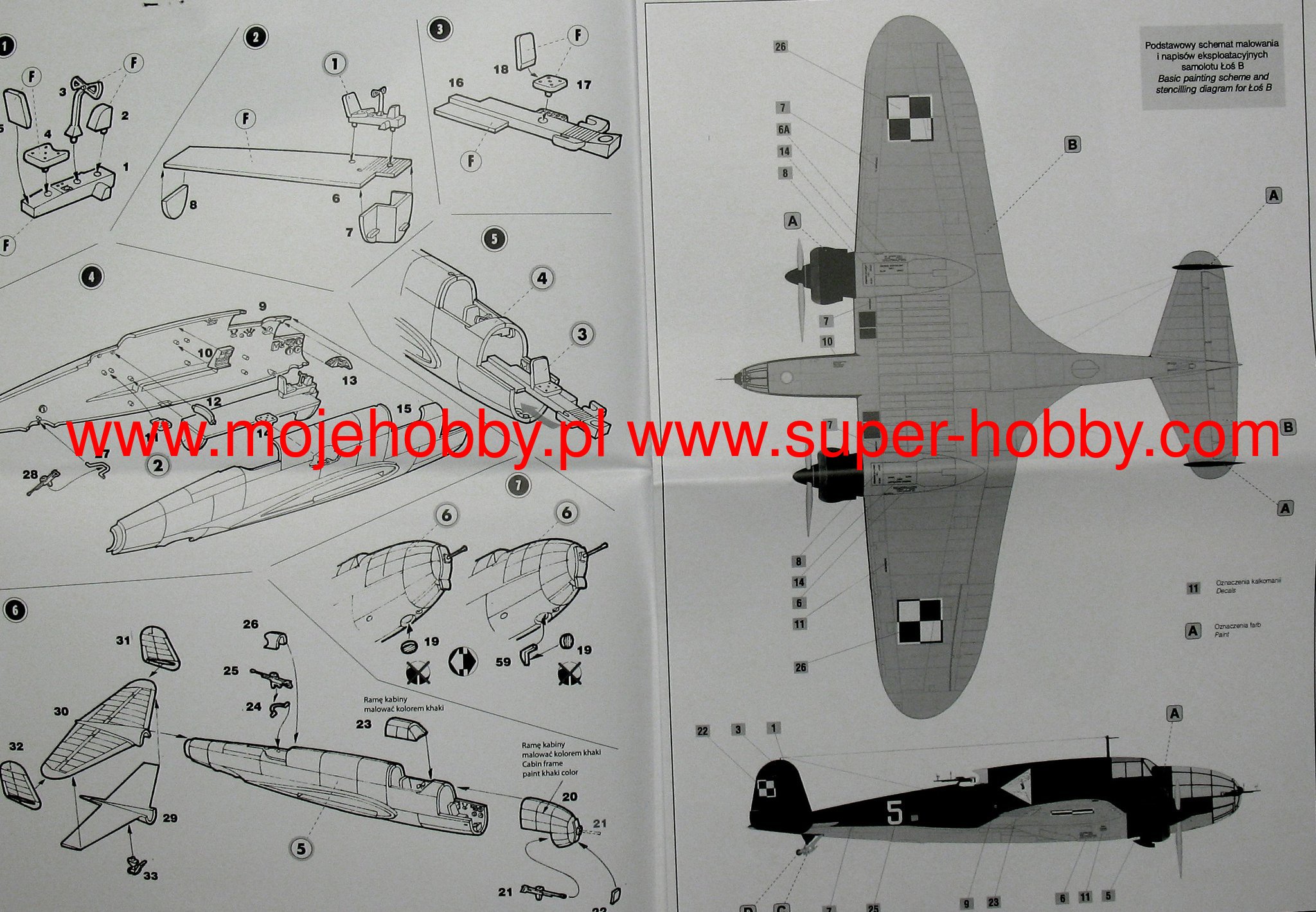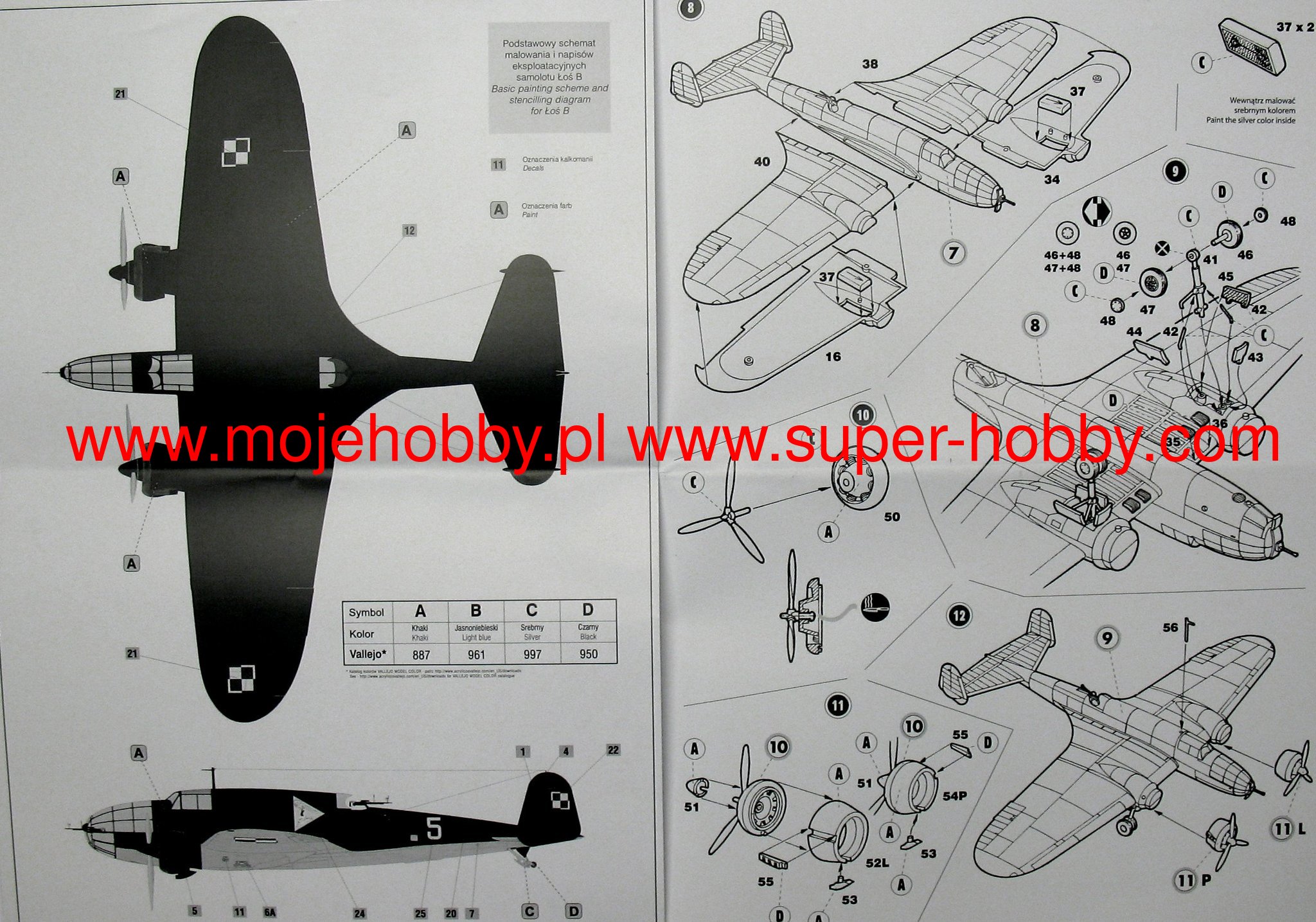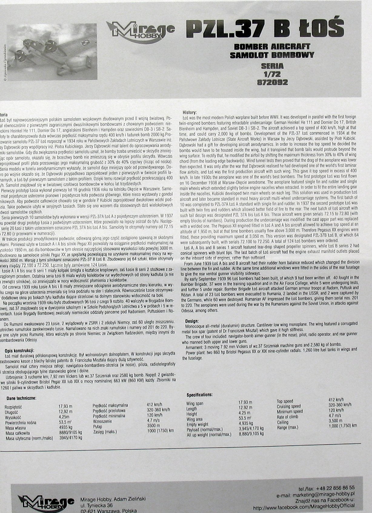 Download Mirage Hobby PDF catalogueThe PZL-37A / B Łoś is a Polish, two-engine low-wing bomber with a full metal structure, with a retractable landing gear. The flight of the prototype took place in December 1936, and serial production continued in 1937-1939. The PZL-37 was the most modern Polish military aircraft built before World War II and the world's first serial aircraft with a laminar wing profile. As a result, it developed a speed in excess of 400 km / h. The plane was among the world's top bombers at the end of the 1930s. By September 1939, 96 Elks had been built, 9 of which were crushed. 40 fought in the Bomb Brigade, while 37 were in the training squadron and in the Aviation Cadet School, and 5 in trials and 5 in repairs. The elk of the Bomb Brigade was fought by the German armored units near Radomsko, Pułtusk and Różan. 23 Łosie were evacuated to Romania, 2 landed in the USSR, 2 were captured by the Germans, and 60 were destroyed. The Romanian air force commandeered Łosie. Romanian characters and numbers from 201 to 220 were painted on them. They were used by Romania, which fought on the side of Germany with the Soviet Union, among others for the bombing of Odessa. Technical data (version B): length: 12.92 m, wingspan: 17.93 m, height: 4.25 m, maximum speed: 412 km / h, practical ceiling: 9250 m, maximum range: 1500 km, armament: fixed - 3 machine guns wz.37 7.92mm caliber, suspended - up to 2580 kg of bombs.