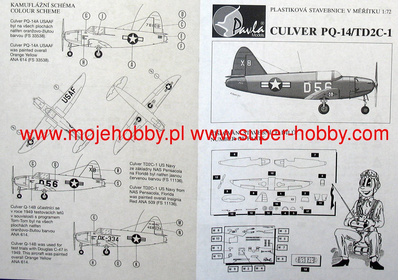 Culver PQ-14 Cadet был американской низкоплановой летающей мишенью с трехопорным шасси - убирающимся в полете времен Второй мировой войны и послевоенного периода. Машина поступила в учебные части в 1942 году. В варианте PQ-14A привод обеспечивался одним двигателем Franklin 6ACT-298-35 мощностью 150 л.с. Длина самолета составляла 5,94 метра при размахе крыла 9,14 метра. Максимальная скорость не превышала 300 км/ч, а запас хода составлял около 820 километров. Culver PQ-14 Cadet был разработан для ВВС США как развитие гражданского самолета Culver LFA Cadet. По сравнению с предшественником он имел более мощный двигатель и был немного увеличен в размерах. Машина PQ-14 управлялась по радио с земли и использовалась для обучения личного состава, прежде всего зенитной артиллерии. Самой многочисленной версией стала модель PQ-14A. Стоит добавить, что ВМС США также использовали эту версию под обозначением TD2C-1. После окончания Второй мировой войны некоторое количество таких мишеней было переоборудовано в самолеты и продано гражданским заказчикам.