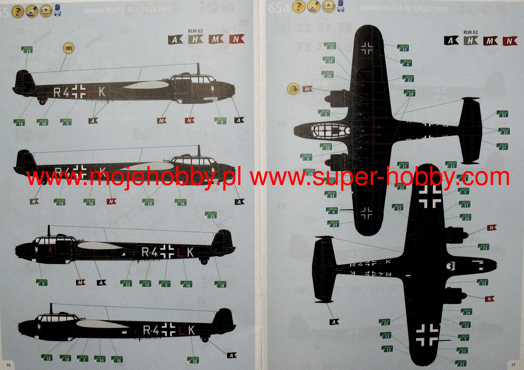 Pierwszy prototyp Do-17C oblatany został 23 listopada 1934 roku. Wkrótce prototyp otrzymał oznaczenie typu Do-17 V1. W maju i wrzeniu 1935 roku miały miejsce pierwsze loty kolejnych dwóch prototypów Do-17 V2 / V3. Od samego poczštku duże zainteresowanie nowš konstrukcjš wykazywał Luftfahrtkommissariat. Pierwszy prototyp Do-17 V1 budowany był włanie dla potrzeb lotnictwa wojskowego, natomiast dwa następne jako samoloty pasażerskie. Samolot w wersji wojskowej posiadał dwie kadłubowe komory bombowe umieszczone po prawej stronie jego centralnej częci, mogšce pomiecić po pięć bomb 50 kg zawieszonych pionowo. Załogę Do-17 V1 tworzyły trzy osoby: pilot zajmujšcy miejsce po lewej stronie kabiny, siedzšcy za nim nawigator-bombardier i strzelec-radiotelegrafista. W obu bocznych cianach kadłuba znajdowały się po cztery niewielkie okienka zapewniajšce strzelcowi lepszš widocznoć. Już w poczštkach roku 1936 przygotowywano produkcję seryjnš wersji Do-17E-1 i F-1. Wkrótce podjęto produkcję obu wersji. Samoloty Do-17F-1 pozbawione zostały celowników i wyrzutników bombowych, wyposażono je za to w dodatkowy zbiornik paliwa oraz w trzy stałopasmowe kamery fotograficzne. W roku 1937 powstały również wersje Do-17E-2 i E-3, a następnie również Do-17F-2 różnišce się nieznacznie wyposażeniem od swoich poprzedników. Ogółem wyprodukowanych zostało 536 egzemplarzy samolotów Do-17 E i F, z tego 268 w macierzystej wytwórni, a pozostałe na licencji w innych zakładach. Od poczštku 1937 roku maszyny te zaczęły wchodzić na wyposażenie jednostek Luftwaffe. Najszerzej produkowanš wersjš był model Do-17Z, który powstał w liczbie 872 egzemplarzy. Samolot wietnie się sprawdził podczas wojny domowej w Hiszpanii oraz kampanii wrzeniowej. Brał także udział w walkach przeciwko Francji i w bitwie o Anglię w 1940 roku. Poniósł tam stosunkowo wysokie straty co sprawiło, że po 1940 roku był sukcesywnie zastępowany w jednostkach liniowych przez bombowce Ju-88 oraz He-111. Wycofane Do-17 pełniły przede wszystkim zadania holowników szybowców. Dane techniczne (wersja Do-17Z): Prędkoć maksymalna: 410 km/h, pułap maksymalny 8200 m, promień działania: 1010 km, uzbrojenie: stałe-6 karabinów maszynowych MG15 kal.7,92mm podwieszane-do 1000kg bomb. Co oprócz modelu będę potrzebować do jego sklejenia?