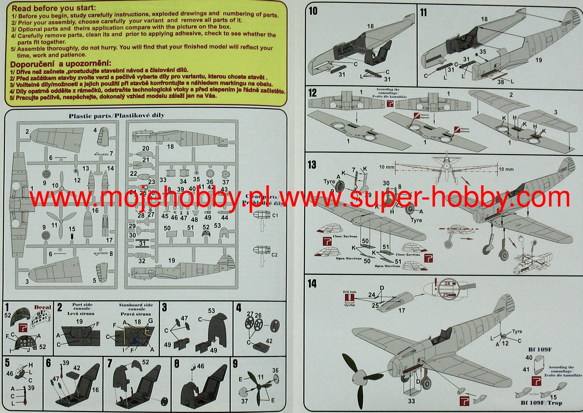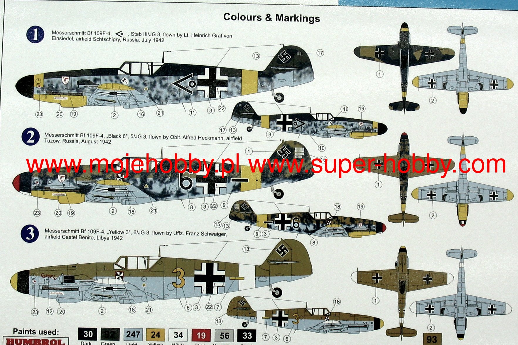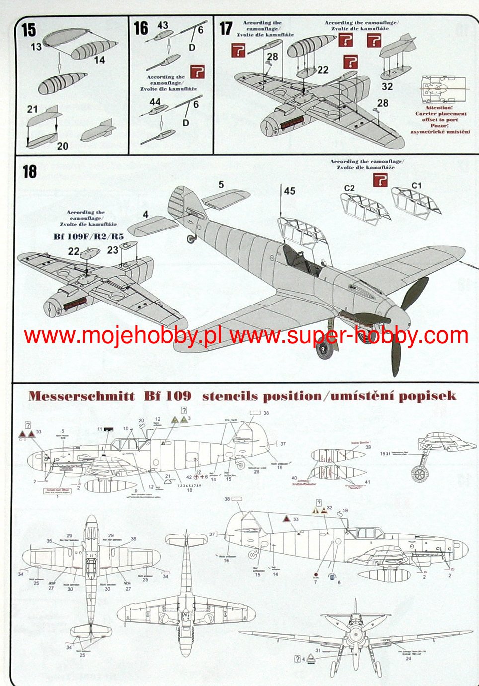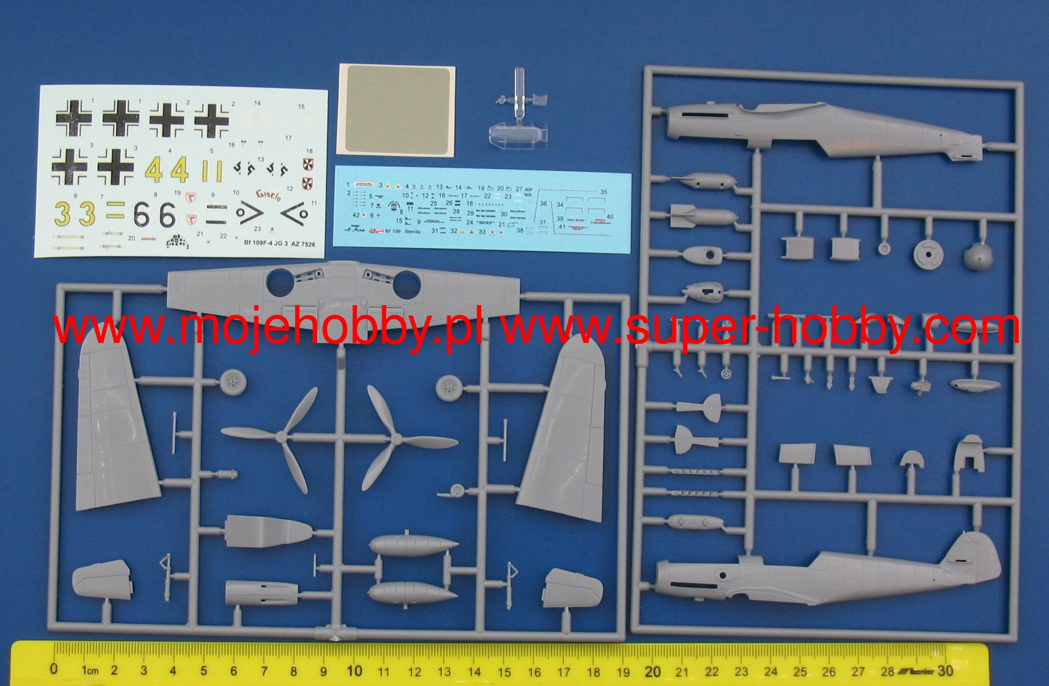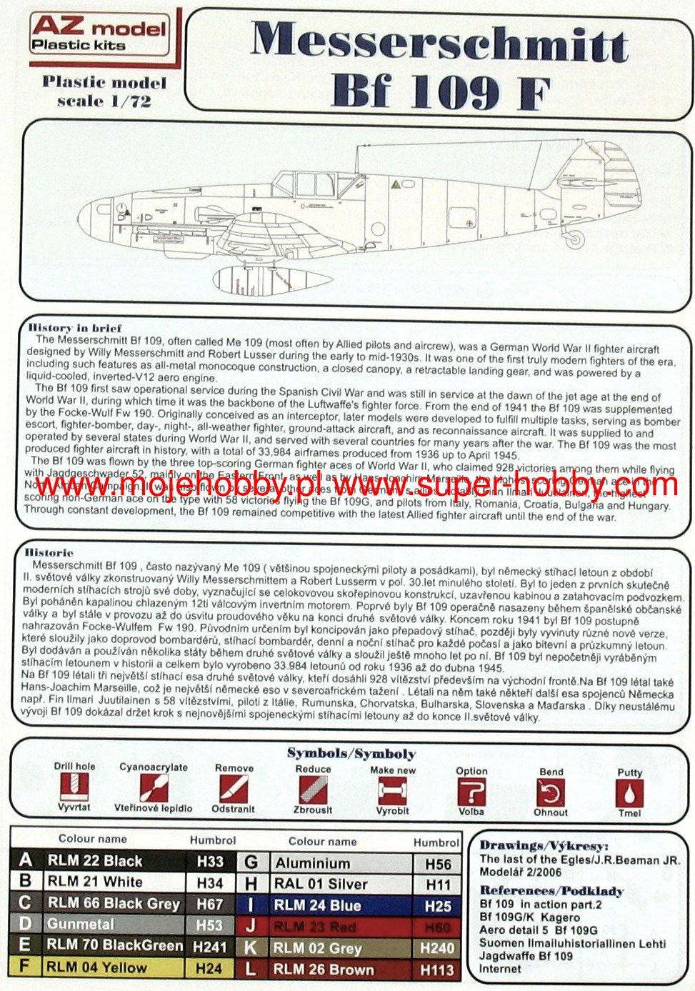 Messerschmitt Bf-109 to niemiecki, jednosilnikowy samolot myliwski o konstrukcji metalowej, w układzie dolnopłata z usterzeniem klasycznym. Okazał się podstawowym i najliczniej produkowanym myliwcem Luftwaffe w czasie II wojny wiatowej. Oblot prototypu miał miejsce 29 maja 1935 roku, a produkcja seryjna trwała w latach 1936-1945. W sumie szacuje się, że łšcznie wyprodukowano około 35000 myliwców Messerschmitt Bf-109 wszystkich odmian, z czego wiele po wojnie trafiło do sił powietrznych Czech i Izraela. Korzenie Bf-109 sięgajš konkursu ogłoszonego w 1933 roku przez Luftwaffe na nowy samolot myliwski. W konkurencji z He-112, projekt Bf-109 poczštkowo przegrał, ale dzięki intrygom Williego Messerschmitta , projekt mógł być kontynuowany i ostatecznie to on okazał się zwycięzcš konkursu, stajšc się podstawowym myliwcem Luftwaffe. W toku produkcji powstało kilka głównych odmian samolotu Bf-109. Pierwszš seriš przedprodukcyjnš był Bf-109B (Berta) z różnymi wersjami silnika Junkers Jumo 210 (A lub Da). Były one testowane w Hiszpanii od 1937 roku w czasie wojny domowej. Kolejna wersja to Bf-109C (Cezar). Posiadały one inny silnik od wersji B, oraz rozbudowane uzbrojenie złożone z dwóch działek 20mm oraz 2 km kal.7,92mm. Także te maszyny walczyły na niebie Hiszpanii. Trzecia wersja to Bf-109D (Dora) z silnikiem Junkers Jumo 210 Da lub Daimler-Benz DB 600. Walczyła ona w kampanii wrzeniowej, ale na przełomie 1939/1940 została zastšpiona przez wersję E. Najsłynniejszym modelem był Bf-109E (Emil) z silnikiem Daimler-Benz 601A lub N. Jako pierwszy model posługiwał się trzy-, a nie dwu-łopatowym migłem. Bf-109E walczyły w kampanii francuskiej, nad Angliš oraz w Afryce Północnej i na froncie wschodnim. Asem, który rozpoczšł swojš karierę włanie na Bf-109E był słynny Adolf Galland. Kolejna wersja to Bf-109F (Friedrich), która zdaniem niemieckich pilotów była najdoskonalsza aerodynamicznie. Posiała zmieniony kształt kadłuba, skrzydeł, owiewki kabiny, ale nie zastosowano nowego silnika. Wprowadzano go do służby na przełomie 1940/1941 roku. W ramach rozwoju konstrukcji opracowywano kolejne specyfikacje Bf-109, z których wersję G (Gustav) wyprodukowano w największej iloci egzemplarzy. Najpoważniejszš zmianš podnoszšcš osišgi maszyny było zamontowanie nowego 12-cylindrowego silnika Daimler-Benz DB605A o mocy 1475KM. Uzbrojenie Bf-109G stanowiła para karabinów maszynowych 13mm znajdujšcych się w kadłubie przed owiewkš kabiny pilota, oraz działko MG151 20mm lub cięższe MK108 30mm. Ostatniš produkowanš na masowš skalę wersjš był Bf-109K (Kurfirst), której produkcja ruszyła w padzierniku 1944 roku. Jako silnik zastosowano jednostkę Daimler-Benz DB 605DB lub DC. Bf-109K był najszybszš wersjš z produkowanych w czasie II wojny wiatowej, osišgajšc do 730km/h. Poza tym powstały dwie wersje- H i Z, były to jednak wersje raczej eksperymentalne i ich produkcja wielkoseryjna nie ruszyła. Kolejne usprawnienia w dziedzinie napędu i uzbrojenia uczyniły Messerschmitta Bf-109 jednym z najgroniejszych myliwców II wojny wiatowej, a jednoczenie pokazały ogromny potencjał drzemišcy w nieco kanciastym płatowcu stworzonym przez Williego Messerschmitta. Dane techniczne (wersja Bf-109 G-6): długoć: 8,95m, rozpiętoć skrzydeł: 9,92m, wysokoć: 2,6m, prędkoć maksymalna: 640km/h, prędkoć wznoszenia: 17m/s, zasięg maksymalny: 850km, pułap maksymalny 12000m, uzbrojenie: stałe- 2 karabiny maszynowe MG131 kal.13mm oraz 1 działko MG151 kal.20mm , podwieszane-250 kg bomb, lub 2 wyrzutnie pocisków Wfr. Gr. 21. Co oprócz modelu będę potrzebować do jego sklejenia?