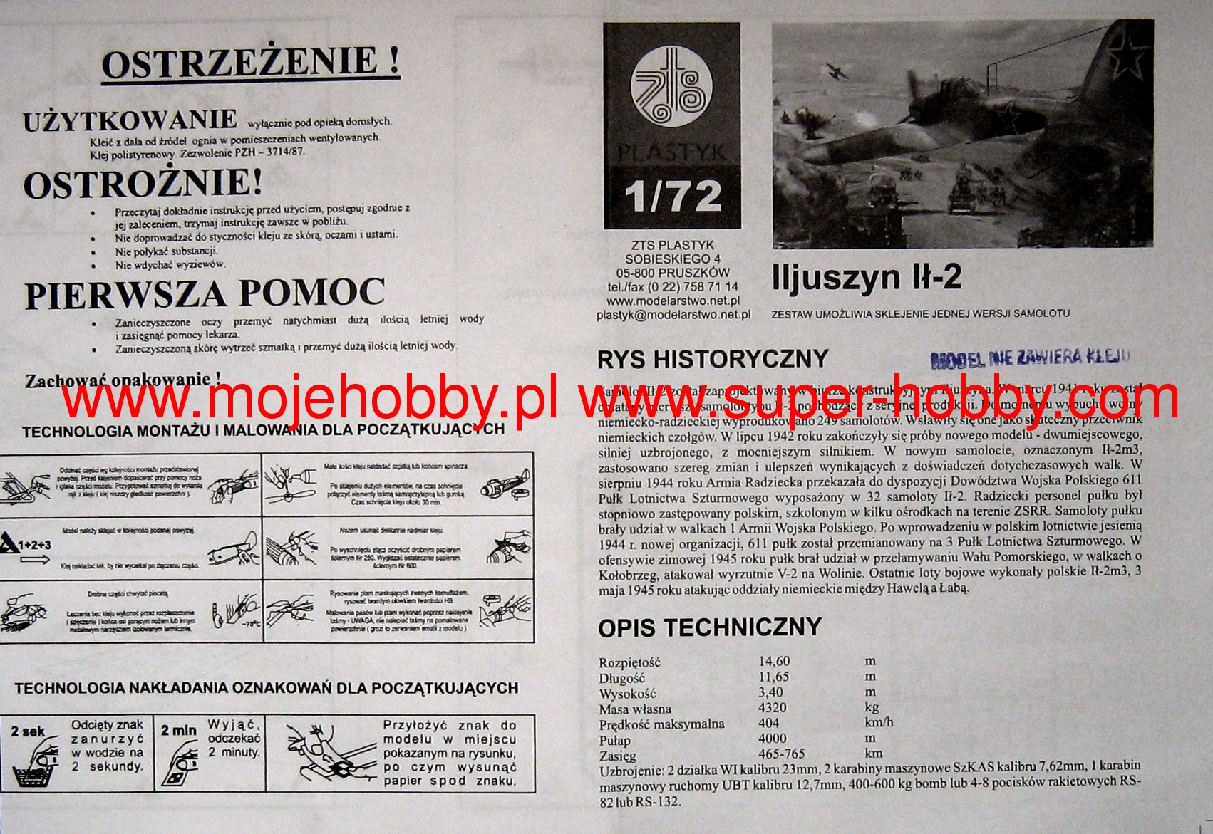 The Ilyushin Il-2 is a Soviet, single-engine low-wing and mixed structure attack aircraft with a classic tail, designed by Sergei Ilyushin from the Second World War. The flight of the prototype took place on October 2, 1939, and serial production started in 1940 and lasted until 1945. In total, as many as 36,183 copies of this great plane were created. The power unit was a 12-cylinder Mikulin AM-38 piston engine with a power of up to 1600 HP. The concept of the Il-2 aircraft was based on the desire to create a heavily armed and heavily armored attack aircraft designed to destroy the enemy's land targets and his armored vehicles. The airplanes produced in series had armor from 4 to 6mm around the engine and cockpit. The Il-2 was therefore resistant to small arms fire as well as to single hits with 20mm cannons. After improving the quality of crew training and applying new tactics, the Il-2 became an aircraft capable of wreaking havoc among the German Panzewaffe. It is no coincidence that the Germans gave him the nickname "flying death", and the designer nicknamed him "flying tank". During the war, a dozen or so versions of Ił-2 were created, the most important of which is Ił2m3. Its crew consisted of two people - a pilot and a rear gunner, the Mikulin AM-38F (1700 KM) unit was used as the engine and a self-sealing fuel tank was introduced. The aerodynamic properties were also improved. In total, 7377 machines of this version were built by 1944. Il-2 took part in all major battles on the Eastern Front - from Moscow (1941) through Stalingrad and Kursk (1942/1943), until the Berlin Operation in 1945. Technical data (version Ił-2 mod.1942): length: 11.65m, wingspan: 14.6m, maximum speed: 426km / h, practical range: 740km, practical ceiling 6200m, armament: permanent - 2 WJ cannons cal. 23mm, 2 x 7.62mm SzKAS machine guns, underslung-8 RS-82 / RS-132 unguided missiles, up to 400 kg of bombs.