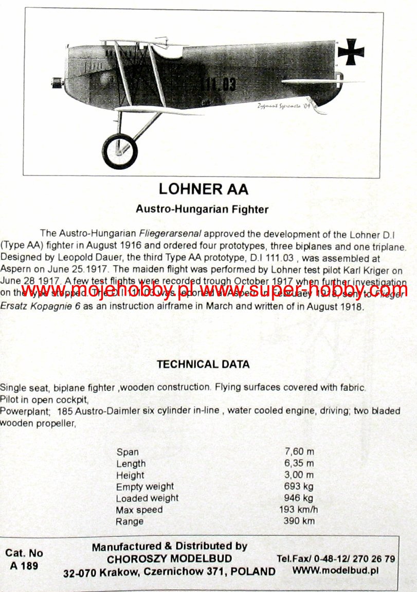The Lohnner AA was an Austro-Hungarian prototype fixed-landing gear biplane fighter from the First World War. The drive was provided by a single Austro-Daimler engine with 185 HP. The prototype's flight took place in 1916 - the machine never entered mass production. The deck armament consisted of two 8 mm Schwarzlose machine guns. The Lohnner AA was commissioned by the Austro-Hungarian Air Force, which commissioned the Lohnner-Werke plant in Vienna to develop a biplane fighter based on the Austro-Daimler engine. The machine had a relatively short and very high hull. During the tests, the machine showed good performance and high top speed, but it also had problems with horizontal flight stability and was rather difficult to pilot. The tall silhouette also made it difficult to take off and land. All these shortcomings caused the Austro-Hungarian Air Force to cancel the project, and the license production of the Aviatik-Berg DI fighter was started at the Lohnner-Werke plant.