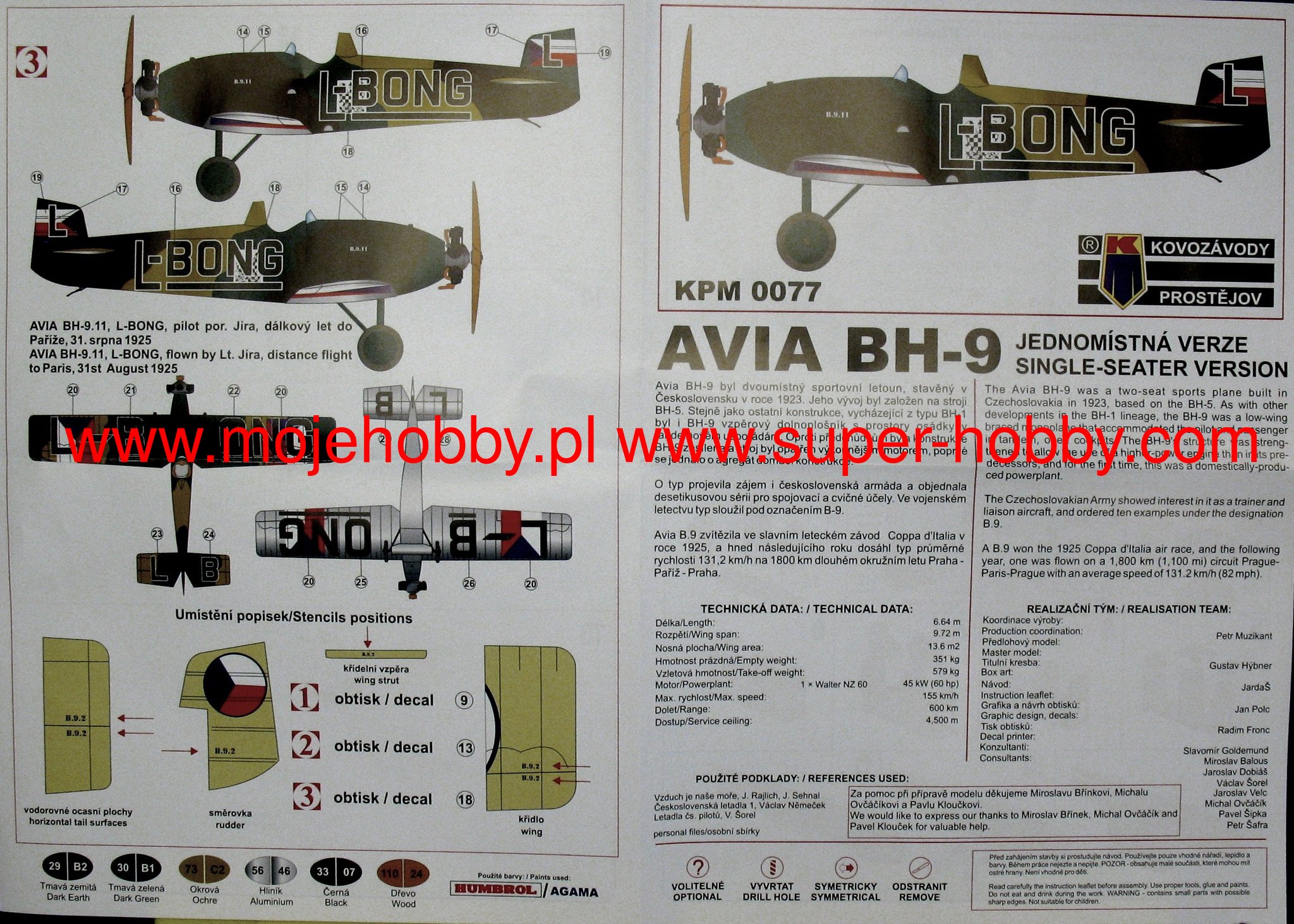 Avia BH-9 был чехословацким низкопланом спортивно-тренировочного периода межвоенного периода. Привод обеспечивался одним двигателем Вальтер НЗ 60 мощностью 60 л.с. Полет прототипа состоялся в 1923 году. Всего было построено около 10-15 самолетов этого типа. Машина не имела постоянного бортового вооружения. ВН-9 создавался как развитие двух других конструкций завода Авиа: ВН-1 и ВН-5. Изменения в основном касались усиления конструкции планера, улучшения его аэродинамики и применения совершенно новой силовой установки, произведенной в Чехословакии. Новым самолетом заинтересовались ВВС Чехословакии, которые закупили 10 самолетов и использовали их в качестве учебных и самолетов связи под обозначением Avia B.9. Самолет Avia BH-9 оказался удачной конструкцией, способной побеждать в международных авиационных соревнованиях, таких как Кубок Италии в 1925 году.