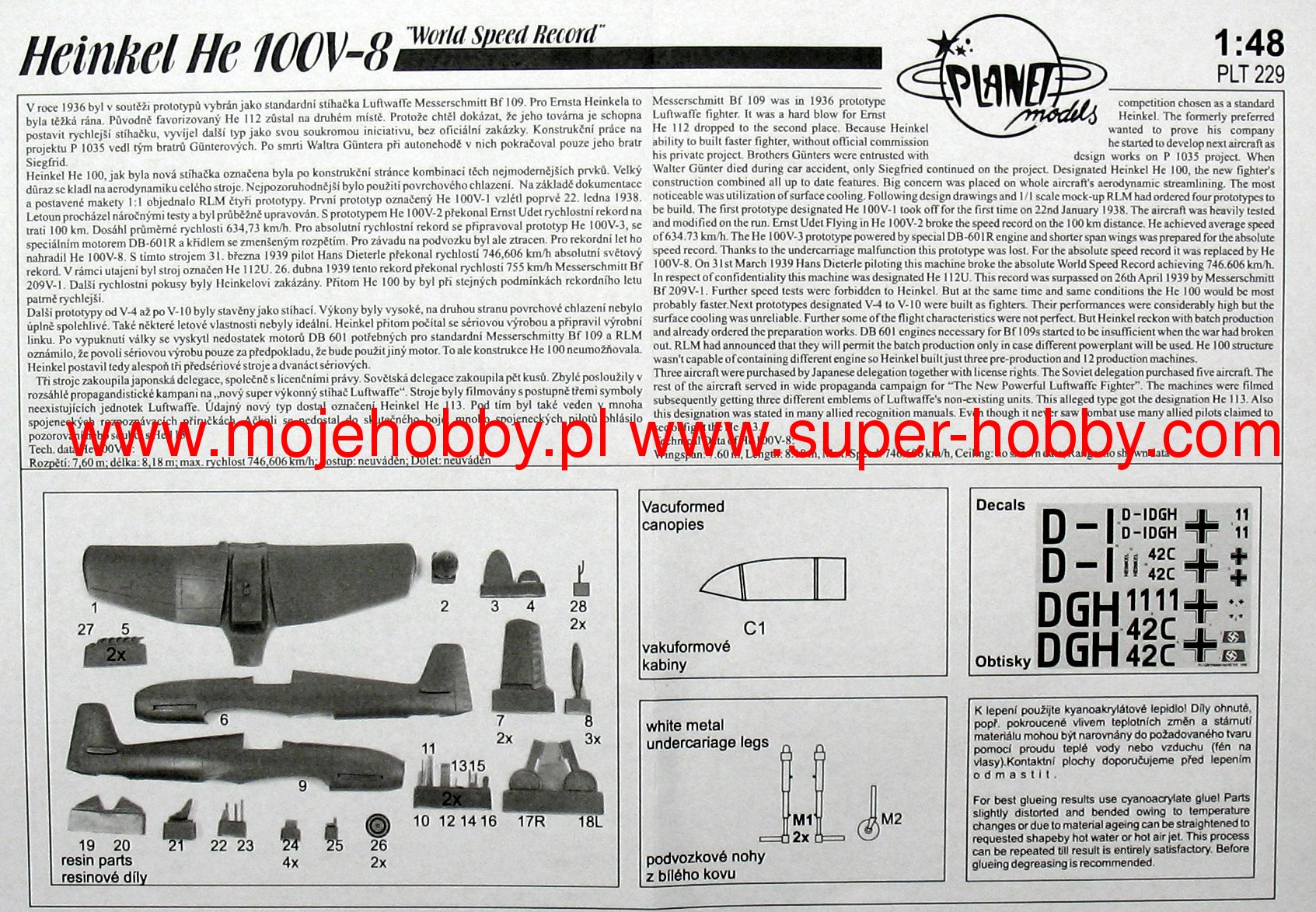 After the defeat of the He-112 prototype in the competition for a standard Luftwaffe single-seat fighter (the Me-109 won the competition), Heinkel began working on a fighter with more modern design and technology on its own initiative. The plane should have been designated He-113, but Heinkel has obtained approval to use the number 100 for Fieseler plants. The first prototype was flown on January 22, 1933, and soon after that, more were flown. The He-100 with the DB-601 engine was a very fast plane. June 6, 1933 the third He-100 V-3 prototype piloted by Ernst Udet broke the 100 km circular speed record, reaching 634 km / h; and March 10, 1939. Hans Dieterle, on a specially adapted prototype He-100 V-8 with a tuned DB-601 engine with a short-term power of 1802KM, achieved a record result of 746.6 km / h! In press reports about both of these records, the fictitious designation of He-112 was given instead of the real designation of the He-100 aircraft. This was related to the ongoing advertising campaign of the He-112 aircraft, which was being prepared for export. The obtained flight speeds were the result of the application of a high load on the wing surface (short wings) and the surface cooling system consisting in evaporation of a part of the cooling fluid on the surface of the airfoil. The converted plane was designated He-100D. Three planes of the trial series D-0 and 12 aircraft of the D-1 series were produced. Ultimately, 6 prototypes of the aircraft (V-1, V-2, V-4, V-5, V-6 and V-7) were transferred to the USSR, 3 He-100 D0 planes to Japan, where they were to be produced under license as A7 Hei, and 12 He-100 D-1 aircraft were organized into a special unit for air defense of the Heinkel plant in Rostock. Factory pilots flew them. It was these planes that were later shown in chronicles and press reports. Technical data (version He-100D-1): length: 8.2 m, wingspan: 9.4 m, height: 3.6 m, maximum speed: 670 km / h, climb speed: 15.1 m / s, maximum range: 1010 km , maximum altitude 11000m, armament: fixed - 1 20mm MG FF cannon and 2 7.92mm MG15 machine guns.