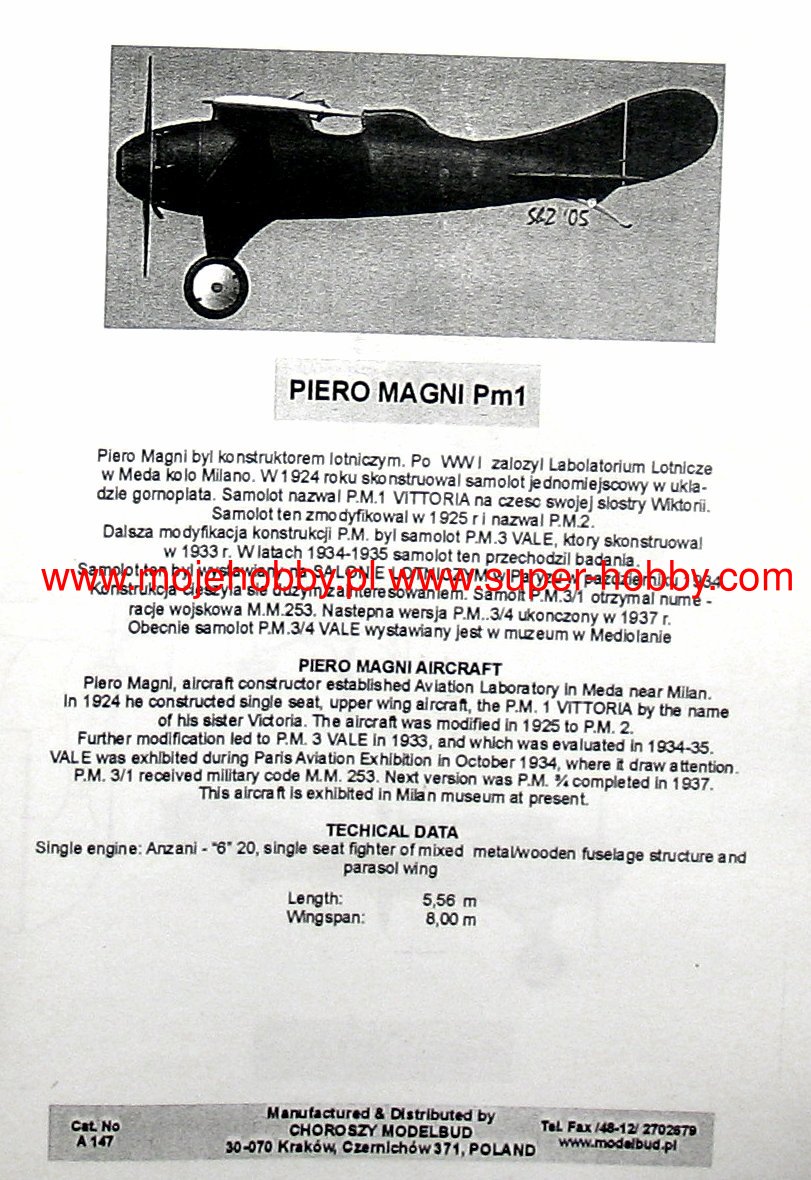 The Piero Magni PM3 / 1 (another designation: Magni Vale PM-3-4) was an Italian sports and aerobatic plane in a monoplane arrangement with an umbrella wing from the interwar period. The drive - in the basic version - was provided by a single engine Farina T. 58 with a power of 130 hp. The flight of the plane took place in 1933 or 1934. plane. The machine did not have on-board weapons. Only two copies of this plane were built. The PM3 / 1 plane was created by the Piero Magni Aviazione aviation plant as a light sports and aerobatic machine, intended for the civil market. For its construction, the plant relied on another of its aircraft: the PM2. In 1937, a copy of the next version was created, designated as Piero Magni PM3 / 4 (another designation: Supervale PM-4-1). It was powered by the new Fiat A.54 engine with 140 hp. Both the PM3s built had good flight characteristics, refined fuselage and airframe aerodynamics, were also maneuverable and relatively easy to pilot. However, the outbreak of World War II prevented Piero Magni Aviazione from developing this promising design.