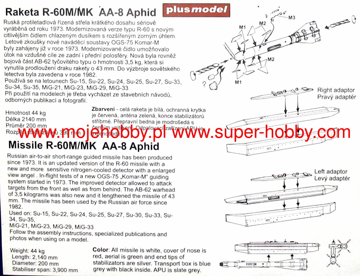 The AA-8 Aphid (also known as R-60) is a Soviet, and now Russian, short-range air-to-air guided missile from the Cold War and modern times. The length of the projectile in the basic version was 209 cm with a span of approx. 40 cm and a diameter of 12 centimeters. The mass of the ready-to-fire projectile was approximately 43.5 kg, while the weight of the warhead was 3.5 kg. However, the maximum range was 8-10 kilometers. Development work on the AA-8 missile started in the 1960s, and the weapon entered service in the Soviet Air Force in 1974. From the very beginning, when designing it, emphasis was placed on the smallest possible size, but also efforts were made to maintain the highest possible combat effectiveness of the missile. Moreover, the R-60 was developed as a fire-and-forget missile, ie it was a typical homing missile that did not require its constant illumination (eg with a radar beam). It is worth noting that in 1982 a modernized version of the missile, designated R-60MK (or Aphid-B), was introduced into service, with increased reliability and an even shorter minimum range than the Aphid-A version. The presented missile was widely exported and found its way to countries such as Bulgaria, Croatia, Poland and Slovakia. It could be carried by such planes as: MiG-21, MiG-23, MiG-31, Su-25 or Jak-38.