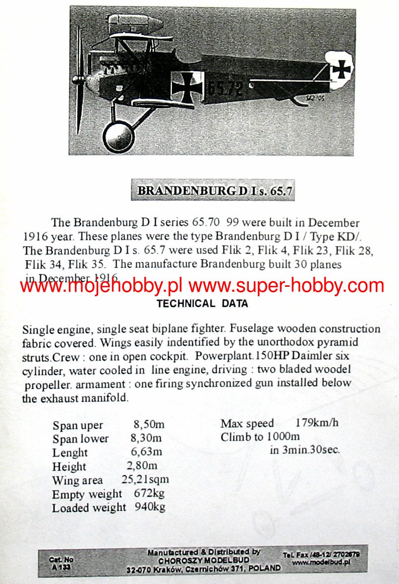 The Hansa-Brandenburg DI was an Austro-Hungarian fighter plane in the biplane, wooden structure, with a fixed undercarriage, of wooden structure, from the First World War. The drive was provided by a single motor Austro-Daimler with 160 or 185 HP. The prototype flight took place in 1916. Serial production started shortly after, leading to the creation of approx. 90-120 aircraft of this type. The deck armament consisted of a single 8 mm Schwarzlose machine gun. The DI was designed by Ernest Heinkel at the Hans und Brandenburgische Flugzeugwerke works on the order of the Austro-Hungarian Air Force (German KuK Luftfahrtruppe). Despite the fact that many elements of the successful Hansa CI machine were used in the new plane, it was characterized by poor flight stability and was difficult to pilot. Despite these disadvantages, the plane was ordered and put into production by the Austro-Hungarian side. The machine entered the line in 1916, but was not appreciated by the pilots. She was one of the primary fighter planes of the Austro-Hungarian Air Force in the period 1916-1917. After the end of World War I, a small number of Hansa-Brandenburg DI machines were used by Austria.