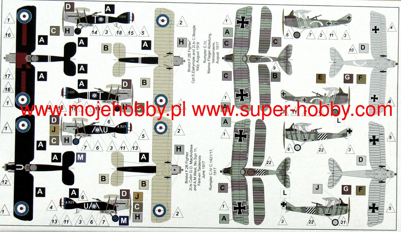 In 1916. the British Royal Flying Corps ordered a two-seater fighter from several aviation companies, which could defend itself against attacks by enemy aircraft. An observer or a shooter in the second cabin, operating a movable machine gun mounted on a turntable, was to contribute to this. The construction of such an aircraft was undertaken by the Bristol company, and at the beginning of 1916. Eng. Frank Bornwell, the company's constructor, designed the plane in a biplane layout, with the fuselage suspended between the wings and with a very close distance between the pilot's and observer's or gunner's open cabins so that they could easily communicate. The prototype of the plane powered by the Falcon in-line engine, designated the Bristol F.2A, was flew on September 9, 1916. During the flight tests, the prototype confirmed the good handling properties and the assumed performance. At that time, 50 of these aircraft were ordered, with which two Royal Flying Corps squadrons were equipped. After introducing a few design changes, the series production of the aircraft, designated the Bristol F.2B Fighter, began. In addition to British aviation orders, the plant also received orders from other countries. Overall, from 1916. by the end of World War I, 3101 Bristol F.2B Fighter aircraft were produced, and after its completion, a further 378 aircraft for British and 49 for foreign aviation. They were also produced under license in the USA of 50 pieces and in Belgium - 40 pieces. For the first time, 6 Bristol F.2B planes from 40 Squadron fought in the air on April 5, 1917. over Arras in France with 5 fighter planes from Richthofen's squadron. The German pilots then shot down 4 English planes without suffering any losses. Only the change of the tactics of using these planes from defensive to offensive showed their advantages and the pilots on these planes achieved a number of victories and so 20 RFC squadron equipped with Bristol F.2B Fighter planes shot down a total of 613 enemy planes. Individually, the most victories on this type of aircraft were achieved by the Canadian crew: Maj. Pil. A. Mac Keever and the gunner LF Powell, the first of them shot down 30 and the second 6 German planes within six months. The advantages of this aircraft, which were confirmed during the fights in World War I, meant that it was used in the British RAF aviation until 1932. Until the mid-thirties, it was also used in aviation, among others in Belgium, China and Spain. Ireland and Mexico. Technical data: Maximum speed: 192 km / h, speed of climb: 5.1 m / s, maximum altitude: 6100 m, maximum range: 467 km, armament: fixed - 3 machine guns, 7.7 mm caliber.The Rumpler C.IV was a German reconnaissance biplane reconnaissance aircraft from the First World War. The prototype flight took place in 1917. The machine entered production in the same year. The drive was provided by a single Mercedes D.IVa engine with 260 HP. The length of the aircraft was 8.41 meters with a wingspan of 12.66 meters. The deck armament consisted of two 7.92 mm machine guns: the LMG 08/15 and the Parabellum MG14. The machine could also carry a load of bombs weighing up to 100 kilograms. The C.IV was developed by Rumpler Flugzeugwerke as an evolutionary development of the C.III. Compared to its predecessor, it differed in the use of a completely new power unit, as well as a different design and shape of the tail section. It is worth adding that the Rumpler 6B-2 seaplane, however, powered by a Mercedes D.III engine was also developed on the basis of this model. During the service, the Rumpler C.IV turned out to be a very successful machine with high performance for a machine of this class and relatively easy to pilot. He was exploitable primarily on the Western Front and in Italy. After 1918, he entered service in the Belgian and Yugoslav aviation.