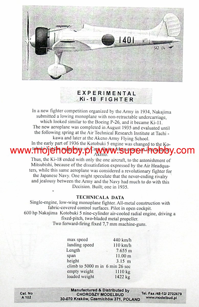 The Mitsubishi Ki-18 was a Japanese prototype monoplane fighter from the interwar period. The drive was provided by a single engine Nakajima Kotobuki 5 700 hp. The prototype flight took place in 1935. The machine never entered mass production. The deck armament consisted of two 7.7 mm Type 89 machine guns. The roots of the Mitsubishi Ki-18 machine go back to the competition announced by the navy command in 1932, which was to lead to the acquisition of a new on-board fighter. Mitsubishi entered the 1MF10 aircraft to this competition, and shortly thereafter the Ka-14. In 1934, the Air Force Command of the Army also announced a competition for a new fighter, and after dissatisfaction with the construction of Kawasaki and Nakajima companies, they asked Mitsubishi to adapt the Ka-14 to the Army's needs. This is how the Ki-18 aircraft was created, which differed from its predecessor with different on-board weapons, other wheel covers for the landing gear and an enlarged rudder. However, after passing a series of tests, the Mitsubishi Ki-18, despite its good performance, was not accepted by the Army due to poor maneuverability and an emergency engine. Probably only one copy of this plane was built.