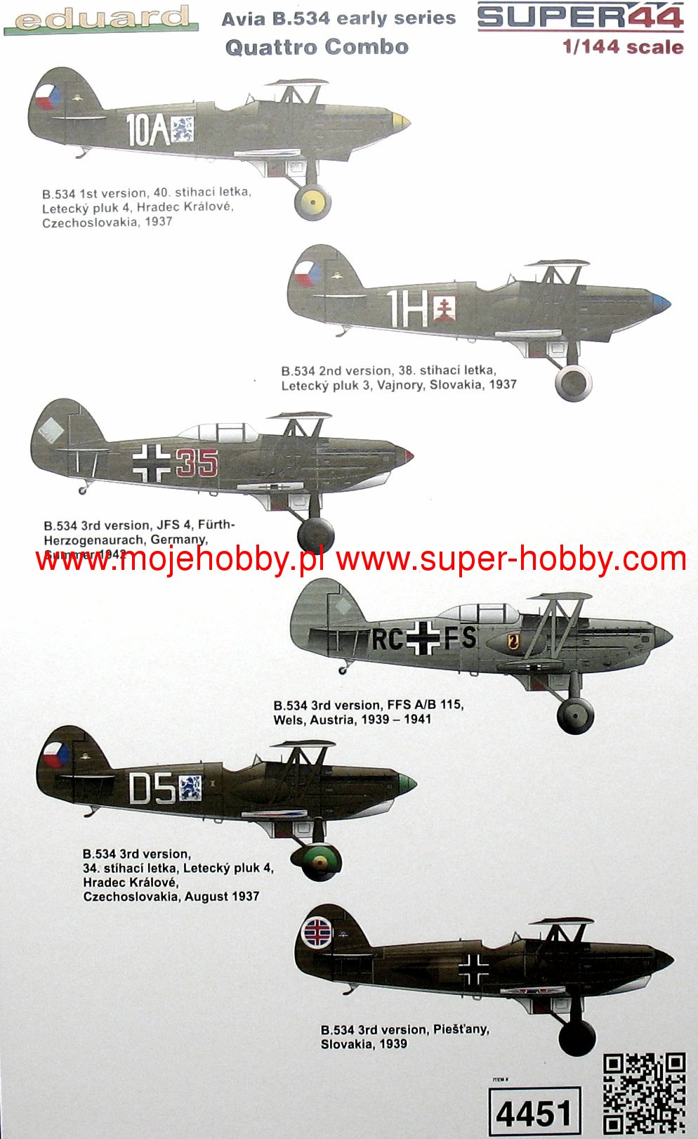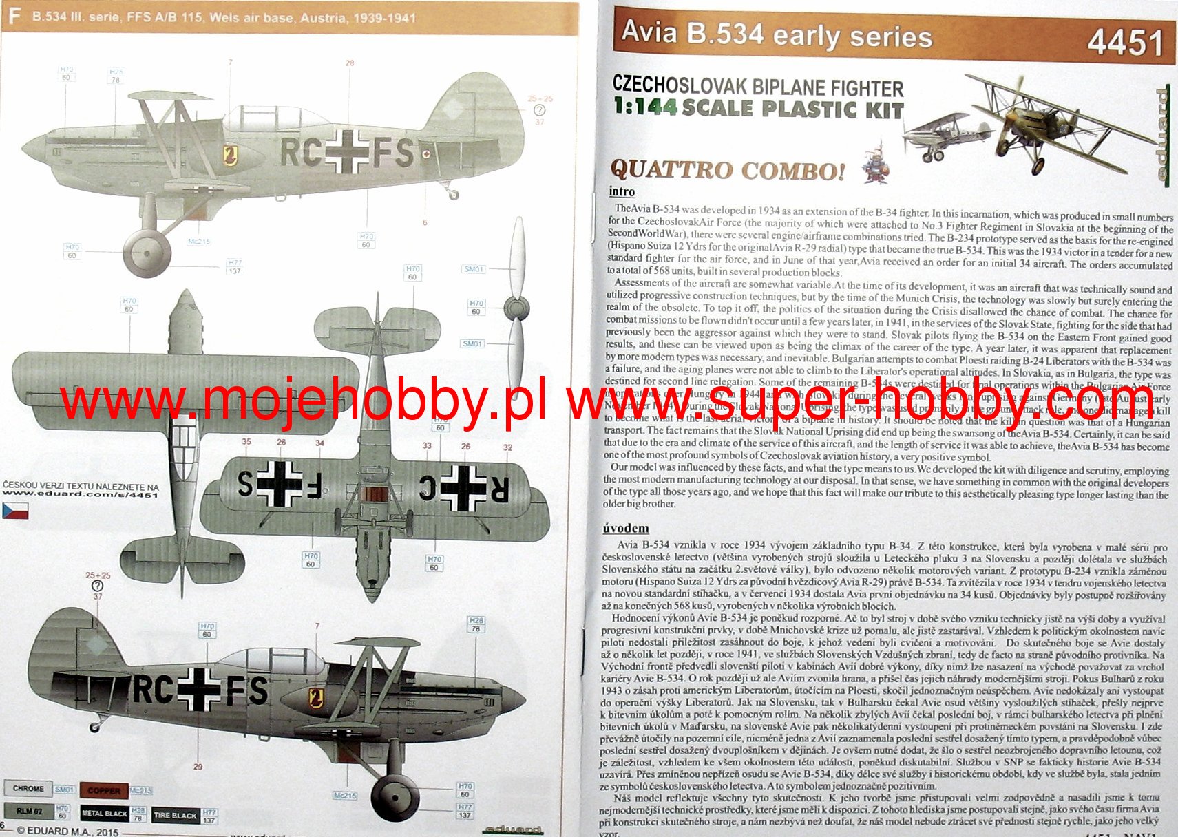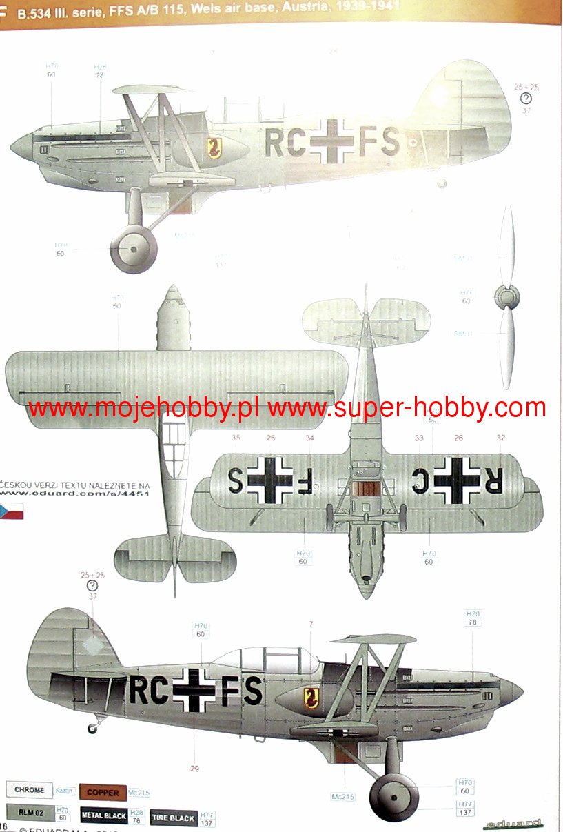 Avia B-534 чехословацкий истребитель бипланной конструкции. Прототипом этой машины послужила неудачная Avia B-234. Первый прототип Avia B-534 поднялся в воздух в августе 1933 года, а серийное производство началось в середине 1935 года. Базовой силовой установкой был французский двигатель Hispano-Suiza 12 Ybrs мощностью 830 л.с. Всего чехословацкая авиация получила 424 самолета этого типа четырьмя серийными партиями, самая продолжительная из которых была поставлена в 1936-1937 годах и насчитывала 271 машину. В этой части прикрыты кабина пилота и металлические пропеллеры. После оккупации Чехословакии производство самолетов продолжилось, завершив производство 83 самолетов в конце 1939 года. Авиа Б-534 имел хорошие летные параметры, был маневренной и высокоманевренной машиной. Технические данные: Максимальная скорость: 415 км/ч, максимальный потолок 10600 м, дальность полета: 580 км, вооружение: стационарное 4 пулемета калибра 7,7 мм или 7,92 мм, подвесное до 120 кг бомб. 3_edu4451_instruction_sheet.pdf