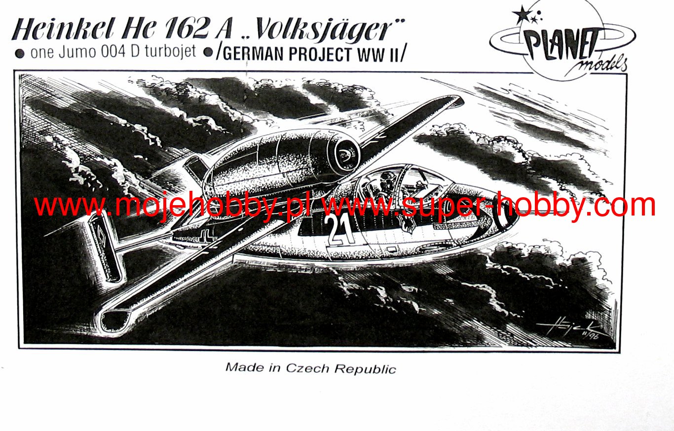 Heinkel He-162 Salamander немецкий одноместный одномоторный реактивный истребитель конца Второй мировой войны. Полет прототипа состоялся 6 декабря 1944 года. Не-162 оказался победителем на т.н. Народный истребитель ( нем . Volksjäger ), который должен был защищать небо Германии от атак тяжелых бомбардировщиков союзников. Самолет имел необычную компоновку с расположением двигателя (MW 003E-1 или E-2) сверху, на фюзеляже, с короткими трапециевидными крыльями и очень аэродинамичным силуэтом. Как и Ме-262, он явился одной из вех в развитии авиации. Однако к концу войны было выпущено всего около 300 самолетов этого типа, и в небольшом количестве они использовались в боевых действиях в апреле и мае 1945 года. Технические данные: длина: 9,05м, размах крыла: 7,2м, высота: 2,6м, максимальная скорость: 790км/ч, скороподъемность: 23,4м/с, максимальная дальность: 975км, максимальный потолок 12000м, вооружение: постоянное -2 20мм MG151 / 20 пушек.