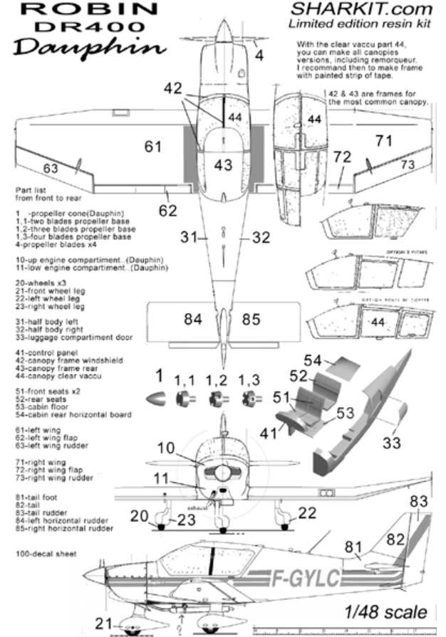 Robin DR400 современный французский спортивно-туристический самолет, деревянной конструкции, с неубирающимся трехместным шасси, в конфигурации с низкорасположенным крылом. Полет прототипа состоялся в 1972 г., в ходе серийного производства было создано более 1290 машин этого типа. Самолет в версии DR400/180 имеет длину 6,96 метра при размахе крыла 8,72 метра. Привод обеспечивается одним двигателем Lycoming O-360 мощностью 180 л.с. Максимальная скорость составляет около 280 км/ч. Robin DR400 был разработан двумя французскими авиаконструкторами, Пьером Робином и Жаном Делемонтезом, как развитие моделей DR200 и DR250. Модель DR400 отличается трехопорным шасси, слегка загнутыми вверх крыльями и полностью деревянной конструкцией, что не только снижает себестоимость производства, но и делает самолет относительно легким. Более того, Robin DR400 считается удачным самолетом, очень простым в управлении, экономичным в эксплуатации и пригодным для модернизации. Кроме того, во время полета он издает мало шума.