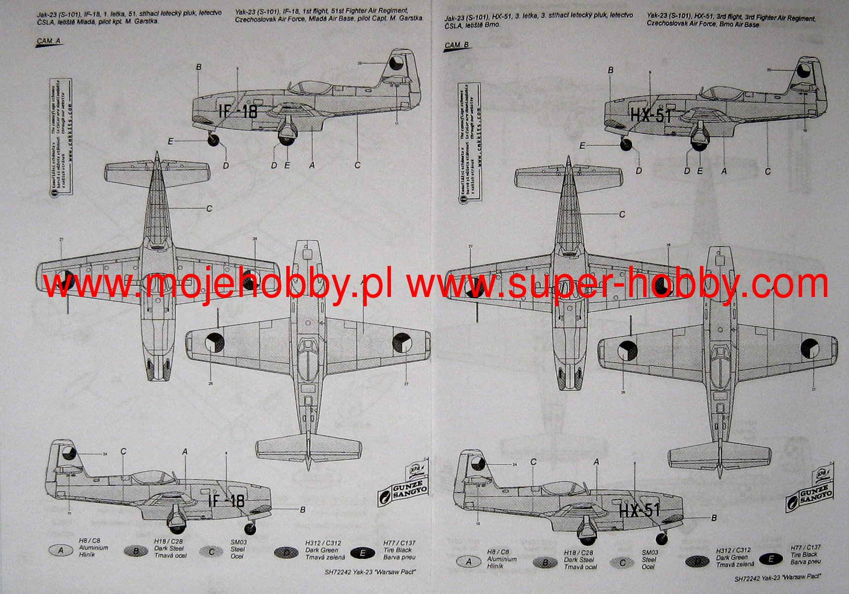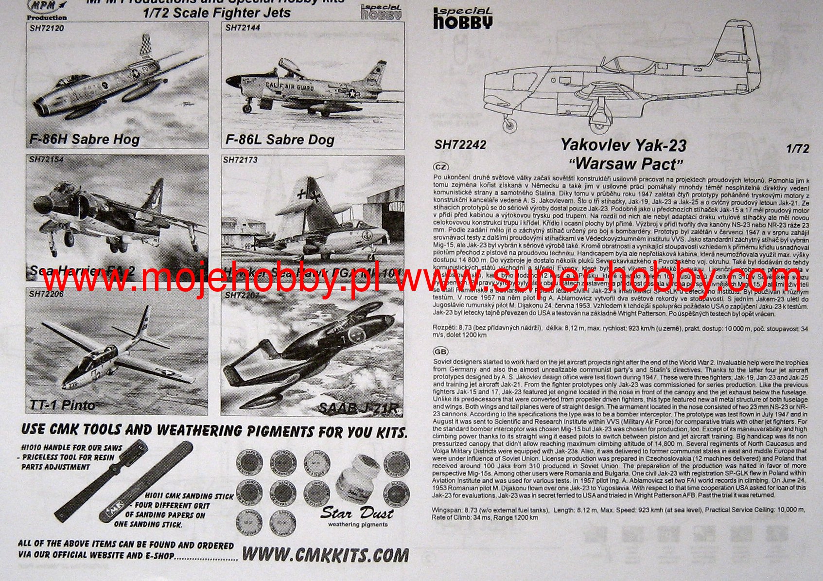 Яковлев Як-23 советский легкий родиевый реактивный истребитель с цельнометаллической конструкцией среднего крыла. Полет прототипа состоялся в 1947 г., а серийное производство продолжалось в период 1949-1950 гг. Силовой установкой служил ТРД Климов РД-500, являвшийся точной копией британского Rolls-Royce Derwent V. Хотя внешне он был похож на Як-15, Як-23 был новой конструкции, с новым двигателем, крыльями и заднюю часть фюзеляжа. В авиации СССР самолет служил сравнительно недолго, базируясь на второстепенных оперативных направлениях. С 1951 года его быстро заменил более современный МиГ 15. Его быстро экспортировали в Болгарию, Чехословакию и, прежде всего, в Польшу, которая закупила около 100 самолетов этого типа. В ходе непродолжительной разработки конструкции было создано три варианта: Як-23 (истребительный вариант), Як-23УТИ (двухместный учебный вариант) и Як-23ДС (прототипный учебный вариант, созданный в Румынии). Технические данные: длина: 8,12м, размах крыла: 8,73м, высота: 3,3м, максимальная скорость: 923км/ч, скороподъемность: 22м/с, практический потолок: 10000м, максимальная дальность (с дополнительными баками): 1030км Вооружение: постоянное - 2 пушки НР-23, 23 мм.