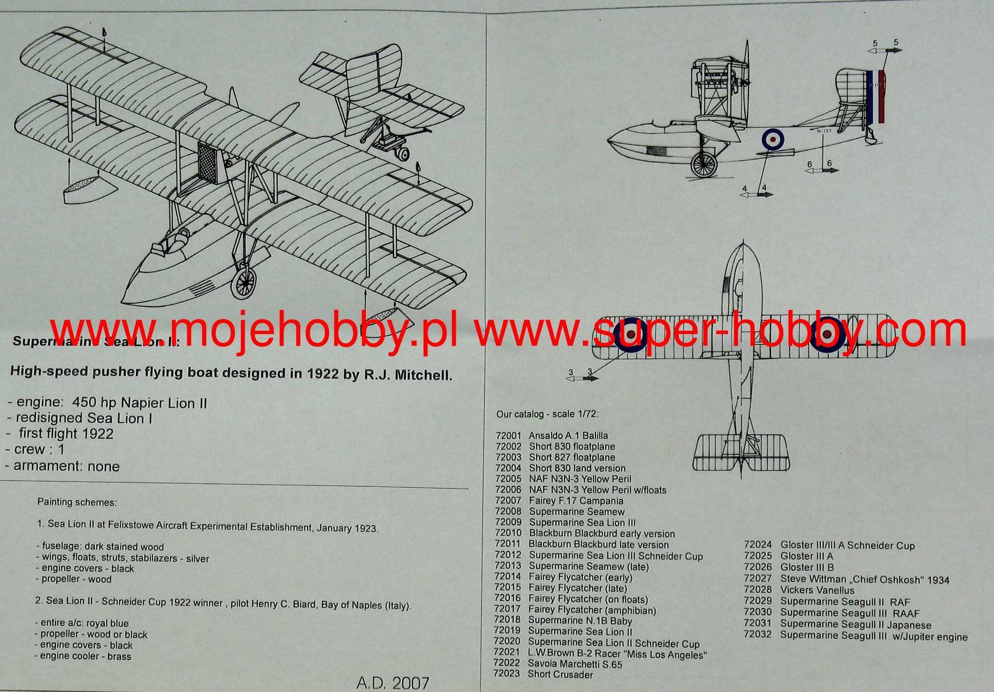 Supermarine Sea Lion II is a British racing flying boat from the interwar period. The drive was provided by a single 450 HP Napier Lion engine. The prototype flight took place in 1922. Only one copy of this plane was built. As a standard, the machine did not carry any weapons. Sea Lion II was designed by Supermarine Aviation Works specifically to participate in the Schneider Trophy competition, which was held in 1922 in Naples, Italy. When developing a new aircraft, the company decided to build on its previous design - the Sea King II. The main modifications concerned the installation of a new power unit with more power, enlargement of the structure and its strengthening. In 1923, a modernized version of the Sea Lion II was developed, marked Sea Lion III, powered by a 550 HP engine, which was also incorporated into the British military aviation in the same year.