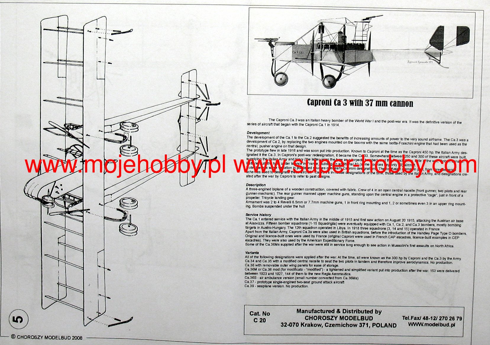 The Caproni Ca.3 was an Italian heavy bomber bomber of a mixed design with a fixed undercarriage. The drive was provided by three motors An Isotta-Fraschini V4B with 150 HP each . The prototype flight took place in 1916 or 1917. Serial production started shortly after, which lasted until 1925 and resulted in the creation of about 470 aircraft of this type. The armament was two 6.5 mm Fiat-Revelli machine guns and a bomb load of up to 450 kg. The roots of the construction of the Caproni Ca.3 machine go back to the period before the outbreak of World War I, when the Italian armed forces - as one of the first in the world - started to develop a multi-engine, heavy bomber plane. The result of this work was the Ca.1 and Ca.2 machines, which were used to create the Ca.3 bomber. In essence, it was very similar to its predecessors - for example, it retained the same unusual engine layout with one push and two pull motors - but it had newer and more powerful engines. The machine entered the line in the first half of 1917 and served until the end of the First World War. The Ca.3 aircraft turned out to be successful - it was reliable, with little failure, it was characterized by a simple but durable structure, it also had decent handling qualities. The quality of the machine can be proved by the fact that after 1918 its production was continued until 1925! It is worth adding that the designation of the planes was changed then: Ca.3 bombers produced in 1917-1918 received the designation Ca.33. and those created after 1918 - Ca.36. Ca.3 planes were also licensed in France.
