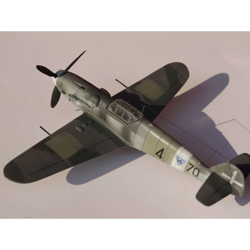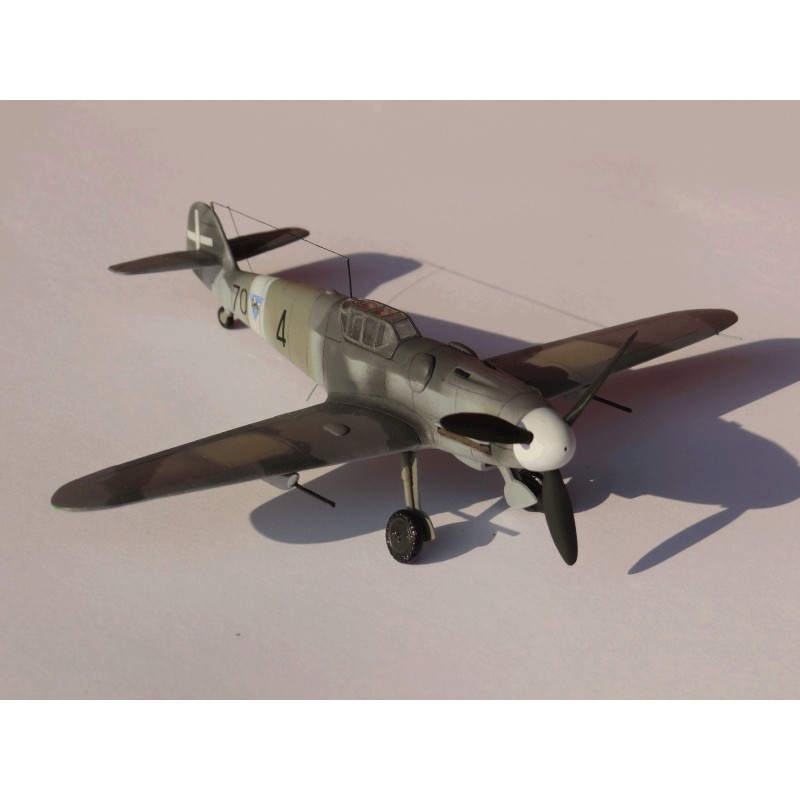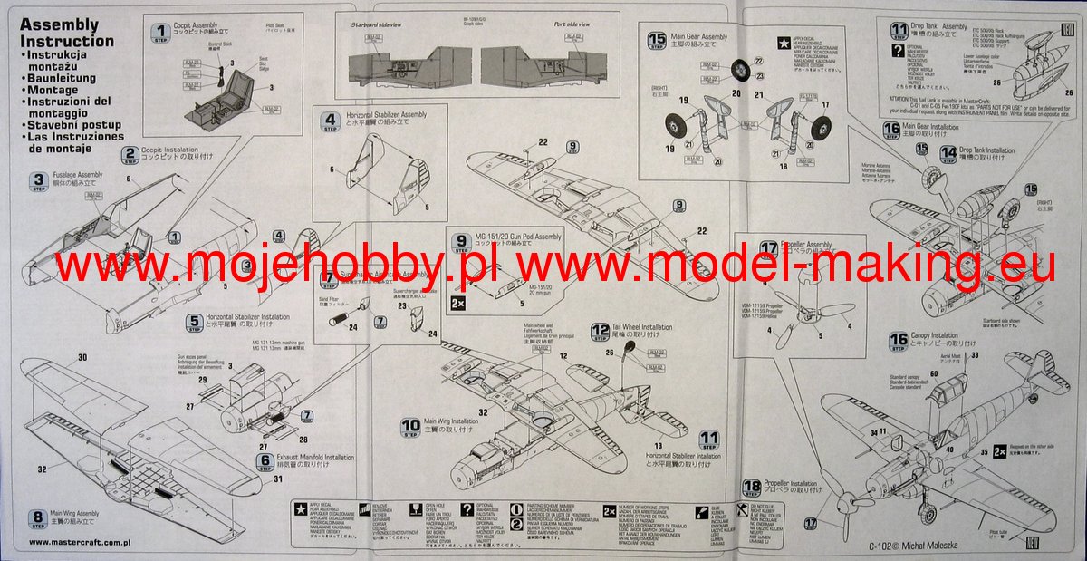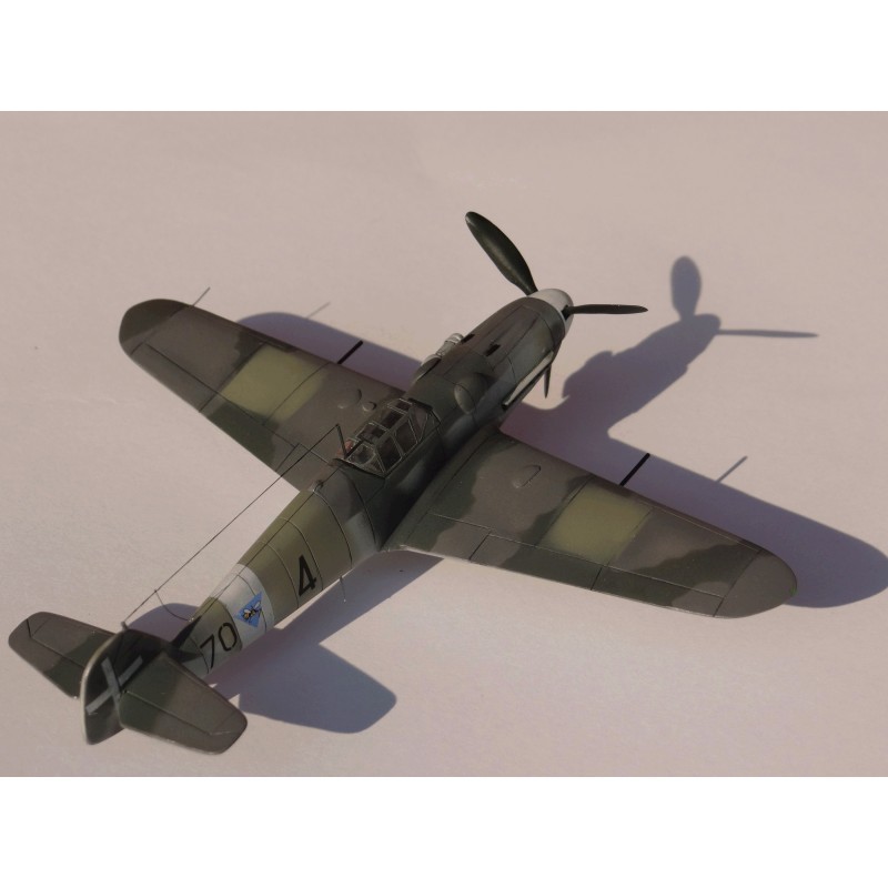 Note: Comany Mistercraft frequently changes, without any notice, the decals that come with the model, so they may differ from the photos and descriptions on our website. If you need a specific version, please let us know about that by entering the appropriate notice in the comments field when placing the order. The Messerschmitt Bf-109 is a German metal-structure single-engine fighter in a low wing configuration with a classic tail. It turned out to be the basic and most produced Luftwaffe fighter during World War II. The flight of the prototype took place on May 29, 1935, and serial production continued in the years 1936-1945. In total, it is estimated that a total of about 35,000 Messerschmitt Bf-109 fighters of all varieties were produced, many of which ended up in the Czech and Israeli air forces after the war. The roots of the Bf-109 go back to the competition announced in 1933 by the Luftwaffe for a new fighter plane. In competition with the He-112, the Bf-109 project initially lost, but thanks to Willie Messerschmitt's intrigues, the project could continue and eventually he was the winner of the competition, becoming the Luftwaffe's primary fighter. Several main variants of the Bf-109 were developed in the course of production. The first pre-production series was the Bf-109B (Berta) with different versions of the Junkers Jumo 210 (A or Da) engine. They were tested in Spain from 1937 during the Civil War. The next version is the Bf-109C (Caesar). They had a different engine than the B version, and extensive armament consisting of two 20mm and 2 HP 7.92mm cannons. These machines also fought in the skies of Spain. The third version is the Bf-109D (Dora) with the Junkers Jumo 210 Da or Daimler-Benz DB 600 engine. It fought in the September campaign, but at the turn of 1939/1940 it was replaced by the E version. The most famous model was the Bf-109E (Emil) with a Daimler-Benz 601A or N engine. It was the first to use a three-blade, not a two-blade propeller. Bf-109E fought in the French campaign, over England, and in North Africa and on the Eastern Front. The ace who started his career on the Bf-109E was the famous Adolf Galland. The next version is the Bf-109F (Friedrich), which, according to the German pilots, was the most aerodynamically perfect. It sowed the changed shape of the fuselage, wings, cabin fairings, but no new engine was used. It was put into service at the turn of 1940/1941. As part of the development of the design, further Bf-109 specifications were developed, of which the G (Gustav) version was produced in the largest number of copies. The most important change increasing the machine's performance was the installation of a new 12-cylinder Daimler-Benz DB605A engine with 1475HP. The armament of the Bf-109G was a pair of 13mm machine guns located in the fuselage in front of the cockpit fairing, and the MG151 20mm or heavier MK108 30mm cannon. The last mass-produced version was the Bf-109K (Kurfirst), which production started in October 1944. A Daimler-Benz DB 605DB or DC unit was used as the engine. The Bf-109K was the fastest version produced during World War II, reaching up to 730 km / h. Apart from that, two versions were created - H and Z, but they were rather experimental versions and their mass production did not start. Subsequent improvements in propulsion and armament made the Messerschmitt Bf-109 one of the most dangerous fighters of World War II, and at the same time showed the great potential of the slightly angular airframe created by Willi Messerschmitt. Technical data (version Bf-109 G-6): length: 8.95 m, wingspan: 9.92 m, height: 2.6 m, maximum speed: 640 km / h, rate of climb: 17 m / s, maximum range: 850 km, maximum ceiling 12000m, armament: fixed - 2 MG131 13mm machine guns and 1 MG151 20mm cannon, suspended - 250 kg bombs, or 2 Wfr missile launchers. Gr. 21.