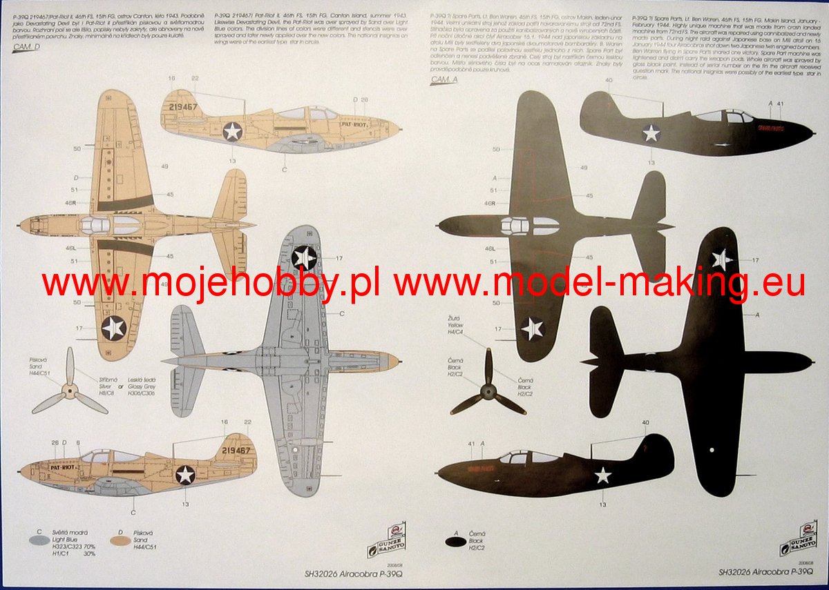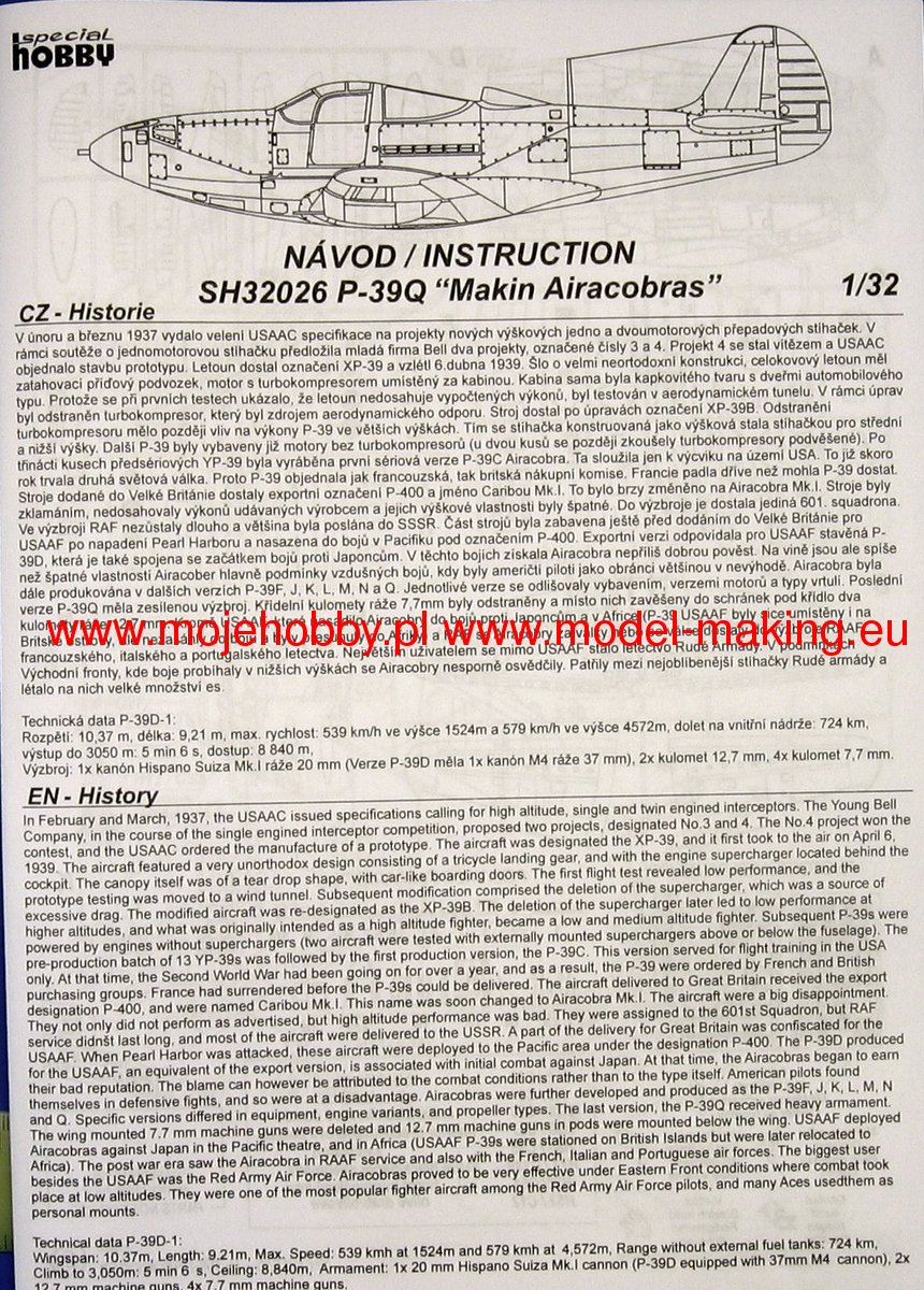 The Bell P-39 Airacobra is an American, single-engine, metal fighter plane with a classic tail in the low wing configuration with a three-wheeled undercarriage. The flight of the prototype took place on April 6, 1938, serial production was carried out in 1940-1944. Despite its conventional appearance, the Bell P-39 Airacobra was a unique design among US Army fighters during World War II, the first with a front wheel. This solution was dictated by the need to install heavy weapons in the nose part of the aircraft, which in turn corresponded to the expectations of the mid-1930s related to ensuring high firepower. In early 1935, the management of Bell Aircraft Corporation was present at the demonstration of the American Armament Corporation - T9 caliber 37 mm. Stunned by the results of the show, it led to the commencement of construction work on a fighter plane using a T9 cannon firing through the propeller hub and additionally equipped with two 12.7mm machine guns installed in the nose part of the fuselage and synchronized with the rotation of the propeller. The decision made to locate the cannon in the nose of the machine imposed the placement of the engine inside the fuselage. The propeller was driven by a long shaft located under the cabin floor. Such an installation of the engine, almost exactly in the center of gravity of the aircraft, entailed the need to use a three-wheeled undercarriage with a front wheel. The first major order for the 369 P-39 was placed in September 1940, and shipments began approximately seven months later. At the same time, the first export units ordered by the British began to leave the production line. They were to replace the worn-out Hawker Hurricane machines. Ultimately, however, the largest foreign recipient turned out to be the Soviet Union, which received about 4,700 aircraft, where the total number of assembled P-39s of all versions slightly exceeded 9,500. Technical data (P-39Q version): length: 9.2 m, wingspan: 10 , 4 m, height: 3.8 m, maximum speed: 605 km / h, speed of climb: 19 m / s, maximum range: 840 km, practical ceiling: 10700 m, armament: fixed - 4 7.62 mm M1919 machine guns, 2 machine guns M2 12.7mm caliber and 1 M4 37mm cannon, suspended - up to 230 kg of bombs.