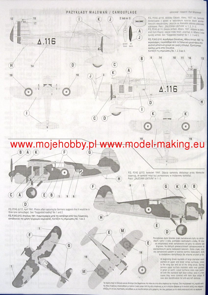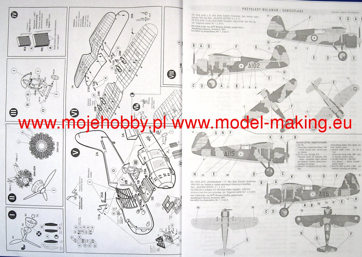 The PZL P.24 is a Polish, one-man interceptor with Puławski wings, a metal structure with a classic tail and a fixed landing gear. The PZL P-24 aircraft was built under the direction of Wsiewołod Jakimiuk and was a modification of the PZP P-11 fighter adapted to the installation of an engine with a power of approx. 1000 HP. The first prototype with a Gnome engine - the Rhone 14 Kds was flown between May 24 and 25, 1933 by Bolesław Orliński. In 1936, the first order was received from Turkey. Soon the P-24s were also purchased by Bulgaria, Greece and Romania, which also acquired a license. In 1937, a new version of the P-24 was developed. The new plane had an 860 HP GR 14N-07 engine, the fuel system and the cooling system were changed. A new engine cover was used and the cabin was armored. Greece was the first to buy the new planes in the number of 25 P-24Fs, armed with 2 cannons and 2 km, and 6 P.24Gs, armed with 4 kms. Poland in 1939. The only surviving P-24 plane is now in the Turkish aviation museum. Technical data (version P.24G): length: 7.81 m, wingspan: 10.68 m, height: 2.7 m, maximum speed: 430 km / h, rate of climb: 11.1 m / s, maximum ceiling: 10,500 m, range maximum: 700km, weapons: fixed - 4 Colt-Browning machine guns, suspended - up to 40 kg of bombs.Download Mirage Hobby PDF catalogue