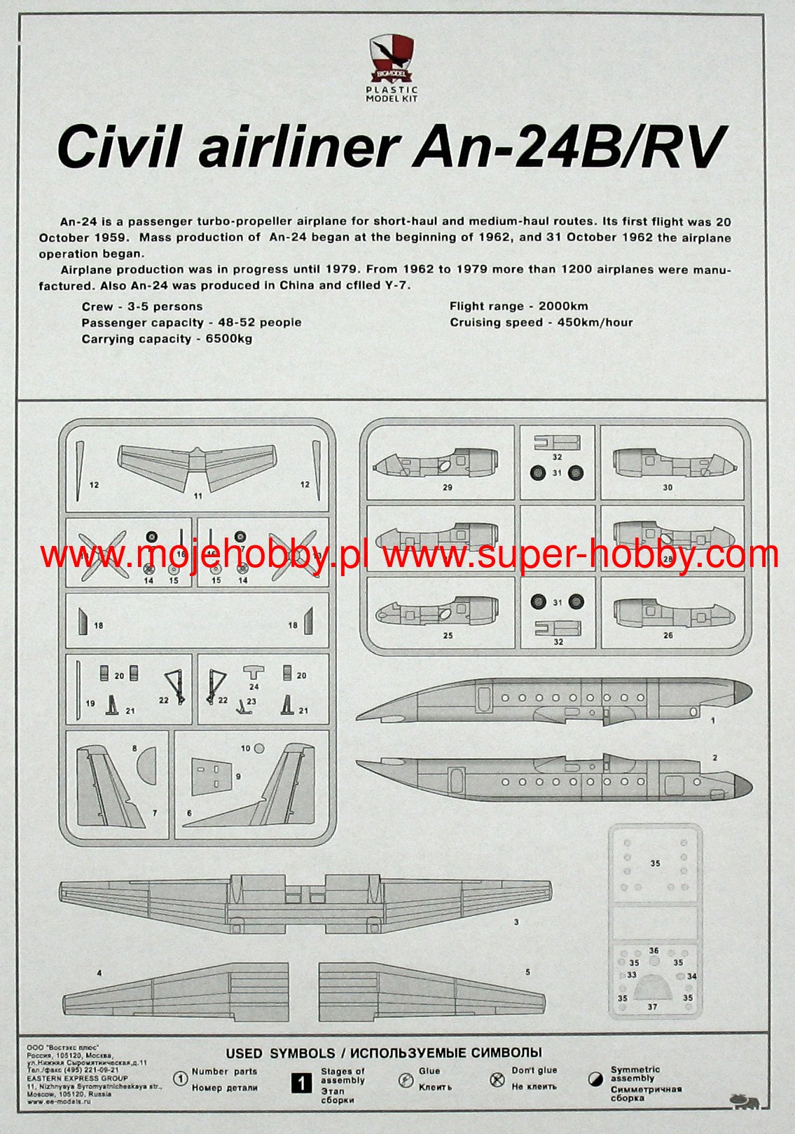 Antonow An-24 był radzieckim, dwusilnikowym samolotem pasażerskim i transportowym w układzie górnopłata z okresu Zimnej Wojny. Napęd zapewniały dwa silniki turbośmigłowe Iwczenko AI-24T o mocy 2820 KM każdy. Oblot prototypu miał miejsce w 1959 roku, a produkcja seryjna trwała w latach 1959-1979. W sumie powstało ok. 1370 samolotów tego typu wszystkich wersji. Antonow An-24 został opracowany w celu zastąpienia w lotnictwie cywilnym i wojskowym coraz bardziej przestarzałych maszyn Ił-14. W stosunku do swego poprzednika nowy samolot cechował się innym układem skrzydeł, zastosowaniem nowych, wydajniejszych silników, znacznie lepszej awioniki i sprzętu łączności. An-24 wymagał również znacznie mniej czasu do przeprowadzenia przeglądu technicznego i został dostosowany do operowania z lotnisk o słabej infrastrukturze. W toku produkcji powstało wiele wersji rozwojowych samolotu między innymi: An-24 (wersja podstawowa), An-24B (wersja o powiększonej kabinie pasażerskiej), An-24T (wersja transportowa) czy An-24P (samolot pożarniczy). Wiele maszyn tego typu pozostaje nadal w służbie. Co oprócz modelu będę potrzebować do jego sklejenia?