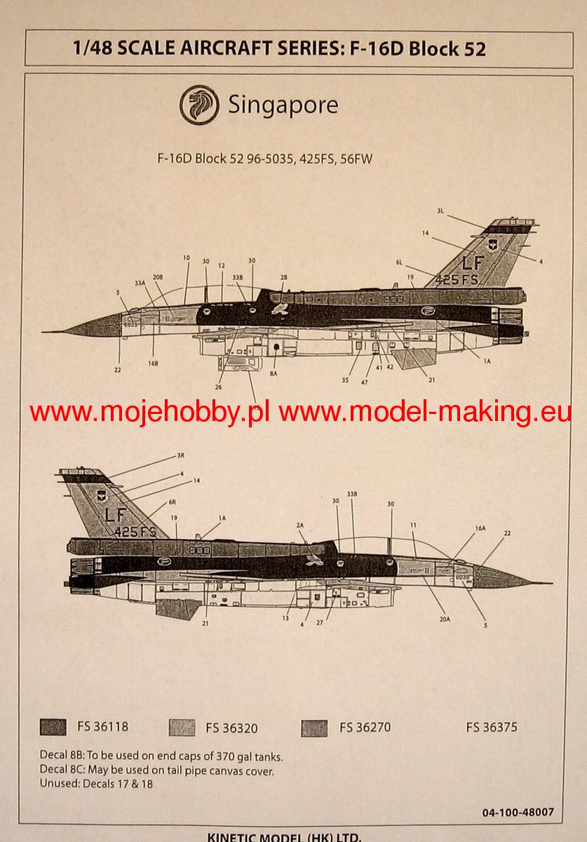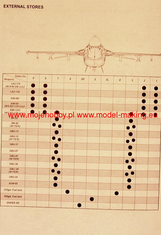 General-Dynamics F16 Falcon to amerykański, jednosilnikowy, wielozadaniowy lekki myliwiec i szturmowiec. Prace nad projektem F-16 rozpoczęto w 1971 roku w koncernie General Dynamics (który w 1993 roku wszedł w skład giganta Lockheed Martin), przystępujšc do konkursu na lekki myliwiec wielozadaniowy (LWF) dla amerykańskich sił powietrznych. Prototyp YF-16 oblatano 2 lutego 1974 roku. Przełomowym pod względem technicznym rozwišzaniem było zastosowanie w nim komputerowego elektrycznego układu sterowania fly-by-wire, który umożliwiał zmniejszenie powierzchni skrzydeł i usterzenia, a tym samym obniżał masę całego samolotu. F-16 był pierwszym myliwcem na wiecie, na którym zastosowano taki system. Pierwsze wersje w bardzo dużym stopniu były zbudowane ze stopów aluminium (ok.83% całoci konstrukcji), jednak z czasem ustępowały one miejsca kompozytom. Różne wersje F-16 sš napędzane trzema wersjami silników: Pratt-Whitney F-100-PW-200, General Electric F110-GE100 oraz Pratt-Whitney F-100-PW-2020. Mózgiem systemu naprowadzania był radar APG-66, zastšpiony póniej przez radar APG-68(V). Warto zaznaczyć, iż konstrukcja YF-16 okazałš się na tyle udana, żę zwyciężyła nie tylko w konkursie na LWF w USA (w konkurencji z samolotem Northrop YF-17), lecz wygrała także kontrakt stulecia na myliwiec wielozadaniowy dla europejskich krajów NATO. Jego rywalami były maszyny Dassault Mirage F.1 i SAAB J-37 Viggen. Produkcję seryjnš F-16 rozpoczęto w 1975 roku. Uczestniczyły w niej także europejskie kraje NATO, dla których była ona zastrzykiem nowych technologii lotniczych. Montażu ostatecznego dokonywano w USA, Belgii i Holandii. Pierwszy seryjny F-16A Fighting Falcon oblatano 7 sierpnia 1978 roku. Jest to wersja szturmowa F-16, przeznaczona przede wszystkim do zwalczana celów naziemnych. F-16 sprawdził się również bojowo, odnoszšc szereg zwycięstw powietrznych w wojnie w Libanie (1982) oraz w trakcie operacji Pustynna Burza (1991). Do końca XX stulecia wyprodukowano ponad 4000 sztuk tego udanego samolotu. Powstało szeć podstawowych wersji samolotu F-16 o oznaczeniach A, C, E (wersje jednomiejscowe) oraz B, D, F (wersje dwumiejscowe). Na bazie tych szeciu modeli tworzone sš liczne modernizacja powišzane najczęciej z wymianš awioniki, oznaczone jako Block. Od 2006 roku F-16 służy również w polskim lotnictwie. Polskie Ministerstwo Obrony zdecydowało, że włanie F-16 stanowić będzie trzon modernizowanych sił powietrznych, odrzucajšc oferty także Dessault i SAAB, choć w tym wypadku ich przedmiotem były myliwce Mirrage F2000 i JAS-39 Grippen. Niewštpliwie duże znaczenie przy podejmowaniu decyzji miała najwyższa suma zaproponowana przez amerykański koncern w ramach tzw. transakcji offsetowej. Dane techniczne: Prędkoć maksymalna: 2170 km/h, prędkoć wznoszenia: 254 m/s, pułap maksymalny 15240m, zasięg maksymalny: 3890km, uzbrojenie: stałe-jedno działko szeciolufowe M61A-1 kal.20mm, podwieszane-do 9275kg ładunku. Co oprócz modelu będę potrzebować do jego sklejenia?