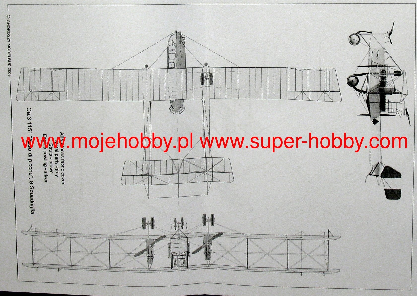 The Caproni Ca.3 was an Italian heavy bomber bomber of a mixed design with a fixed undercarriage. The drive was provided by three motors An Isotta-Fraschini V4B with 150 HP each . The prototype flight took place in 1916 or 1917. Serial production started shortly after, which lasted until 1925 and resulted in the creation of about 470 aircraft of this type. The armament was two 6.5 mm Fiat-Revelli machine guns and a bomb load of up to 450 kg. The roots of the construction of the Caproni Ca.3 machine go back to the period before the outbreak of World War I, when the Italian armed forces - as one of the first in the world - started to develop a multi-engine, heavy bomber plane. The result of this work was the Ca.1 and Ca.2 machines, which were used to create the Ca.3 bomber. In essence, it was very similar to its predecessors - for example, it retained the same unusual engine layout with one push and two pull motors - but it had newer and more powerful engines. The machine entered the line in the first half of 1917 and served until the end of the First World War. The Ca.3 aircraft turned out to be successful - it was reliable, with little failure, it was characterized by a simple but durable structure, it also had decent handling qualities. The quality of the machine can be proved by the fact that after 1918 its production was continued until 1925! It is worth adding that the designation of the planes was changed then: Ca.3 bombers produced in 1917-1918 received the designation Ca.33. and those created after 1918 - Ca.36. Ca.3 planes were also licensed in France.