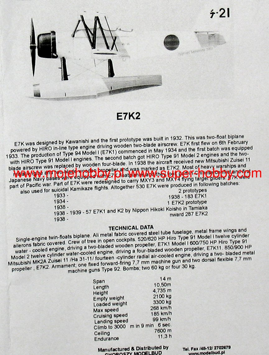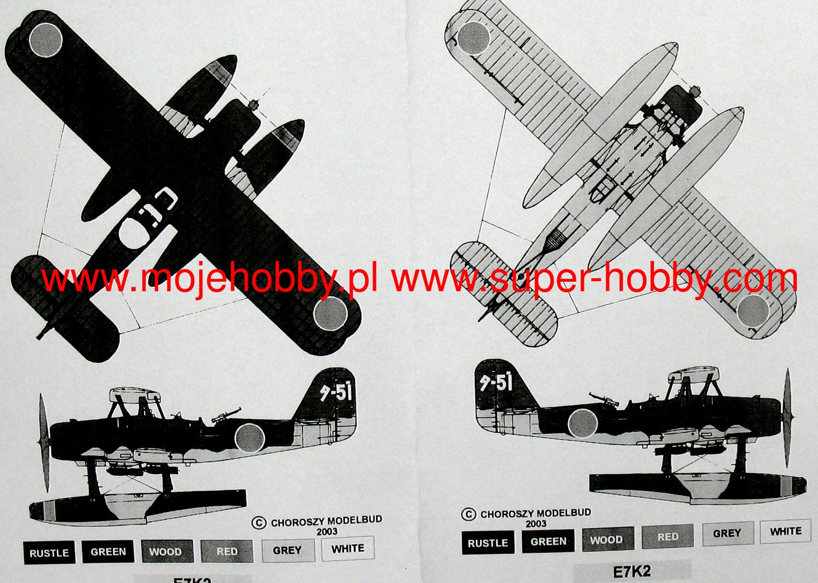 The Kawanishi E7K is a Japanese mixed metal-canvas reconnaissance seaplane for WWII ships. The crew consisted of three people. The prototype flight took place in February 1933 and the machine entered mass production in the same year. The E7K replaced the older E5K1 machine in the line. Two versions of this very successful plane were created. The first one, powered by a 600HP Hiro Type 91 engine, was called E7K1. The production series consisted of 183 machines of this version. The second, designated E7K2, was powered by a 900HP Mitsubishi Zuisei 11 engine, which significantly improved performance, and also had slightly different dimensions than the previous version. 347 were produced. Both versions were manufactured by Kawanishi Kokuki KK in Nauro and Nippon Hikoki KK in Tomioka. Technical data (version E7K2): length: 10.5m, wingspan: 14m, height: 4.85m, maximum speed: 275km / h, maximum range: 1850km, maximum ceiling 7060m, armament: fixed-3 machine guns Type 92 cal. .7.7mm, suspended - up to 120 kg bombs.